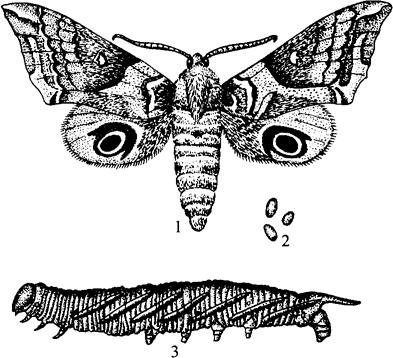 释义 | 蓝目天蛾 【学名】 Smerithus planus Walker。 【别名】 柳天蛾。 【分布与为害】 分布于东北、华北、华东、西南、西北等地。寄主有桃、梅花、海棠、樱桃、柳、杏、李等。幼虫食叶,严重时,把叶片吃光。 【形态特征】 成虫体长32~36毫米,翅展85~92毫米。体、翅黄褐色,胸背面中央有1深褐色大斑。前翅基部有较宽的暗灰色部分。翅中央正前缘处有1个暗色正三角斑纹。在三角形斑纹中有1个半月形白斑,外缘翅脉间内陷成锯齿状,还有三角形深色部分。亚外缘线、外横线、内横线深褐色,波状。近翅后缘处有横列的尖端向外的剑状纹。后翅淡灰褐色,中央有1个深蓝色大圆斑上方为粉红色,斑外有1个灰白色圈,白色圈团围为蓝黑色圈。卵为椭圆形,长径1.8毫米,初产时鲜绿色,有光泽,后变为黄绿色(图9-41)。幼虫体长80~90毫米,黄绿色。头较小,近三角形,头顶侧面有黄白色条纹。体全部散生较稀疏的黄白色微细颗粒。胸腹部各节有横皱多条。气门淡黄色,围气门片黑色,前方常有紫色斑1块。胸部有黄白色颗粒组成的侧线。胸足褐色,腹足绿色,胸腹足两侧有红褐色块状斑纹。腹部第一至八节两侧,各有1条黄白色颗粒组成的向背面斜伸的条纹,最后1条直达尾角。尾角尖细,上有小颗粒。蛹长41毫米,深赤褐色,背中线较突出。 图9-41 蓝目天蛾 1.成虫 2.卵 3.幼虫 【生活习性】 在北京1年2代,江苏1年4代。均以蛹在寄主附近土中越冬。在北京,2代区成虫分别出现在5月中、下旬和6月中、下旬,4代区分别是4月中旬,6月下旬,8月上旬及9月中旬。卵期7~14天。幼虫5龄。 成虫羽化后,第二天交尾,次日产卵。卵产于叶背和枝条上。每雌可产卵200~400粒。1~2龄幼虫分散食嫩叶,4~5龄食量大增,吃光叶片。老熟幼虫在化蛹前2~3天,即从树上爬下钻入土中85毫米处化蛹。 【防治方法】 点灯诱杀成虫。冬季和早春在寄主附近翻土灭蛹。幼虫大量孵化后,喷敌百虫或杀螟松100倍液。 |