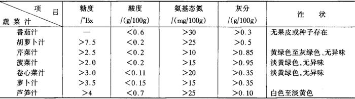 | 释义 | 蔬菜汁与蔬菜汁饮料 1.蔬菜汁及其制品的特性 蔬菜汁是用新鲜或冷藏的蔬菜为原料,在以其可食的根、茎、叶、花、果实以及食用菌、食用藻及蕨类等提取的汁液中加入食盐或糖等调制而成的。蔬菜汁饮料则是在提取的蔬菜汁液中加入水、糖和酸味剂等调制而成的。蔬菜汁及蔬菜汁饮料都可直接饮用。蔬菜汁除添加天然香料外,一般不加水、砂糖或果葡糖浆,更无防腐剂和人工甜味剂,因此是天然、营养型饮料,常作为保健饮料。 蔬菜汁一般为均匀浑浊的汁液,允许有少量微小悬浮肉质,静置后允许轻度分层,浓淡适中,汁液黏稠适度,摇动后应具均匀的浑浊状态。各种蔬菜汁应具有该蔬菜原有的色泽和新鲜时的纯正滋味,无异味。 可以用来加工蔬菜汁的原料有番茄、胡萝卜、芹菜、荷兰芹、菠菜、冬瓜、莴笋、卷心菜、红辣椒以及洋葱、大蒜等,可以加工成原汁(天然蔬菜汁)或浓缩汁。主要天然蔬菜汁标准见表2-1-100。 表2-1-100 主要天然蔬菜汁标准