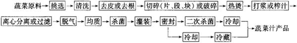 2.蔬菜汁生产工艺流程 蔬菜汁可以用新鲜蔬菜,也可以用蔬菜浆制造,以新鲜蔬菜为原料的生产工艺流程如图2-1-59。