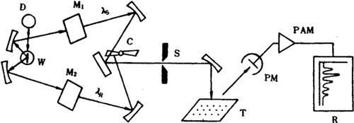 释义 | 薄层色谱分析 1.简介 薄层色谱法从本质上讲亦是一种液相色谱法。它是将作为固定相的吸附剂或支持剂涂到玻璃板或其它载体上形成薄板,将待分离的样品溶液点在薄板的一端,在密闭的容器中用适宜的溶剂展开而形成样品组份斑点来进行色谱分析。此法速度快、效率高,样品用量少(微克级),灵敏度较高(可达10-6~10-9g),而且设备简单、操作方便,广泛地用于生化、医药、环保、石油化工、食品、农业等领域的生产、研究中。 根据涂铺的吸附剂不同或支持剂作用原理不同,薄层色谱可以分为吸附、分配、离子交换和凝胶渗透四类。不论哪一类色谱分离过程都包括制板、展开、定性和定量测量几部分。 (1)制板,即将作为固定相的支持剂或吸附剂均匀地涂布在玻璃板(或其它平板)上形成薄层。涂好的薄层板要表面平整,厚度一致,符合使用要求,并烘干待用。 (2)色谱分离,即将待测混合物样品溶液点在薄板上,选择适当的溶剂为流动相(展开剂)将薄层板浸入流动相中,流动相在毛细作用下带动试样浸润,随着流动相的推进而形成各个样品组分的色谱点。展开剂的选择原则是以溶剂的极性大小为依据的。一般地说,在同一支持剂上,溶剂极性越大,对同一化合物的洗脱能力越强,在薄板上能把它推得越远。薄层展开在密闭容器中进行,展开方式有上行、下行、单向、双向、多次展开等。 (3)试样各组份经展开分离后,在薄板上形成许多与原点样点有一定距离的斑点,每个斑点代表一个可能的组分。组分经分离后在薄板上移动距离用Rf表示: 若予先测定了各种组份标准样的Rf值,则可根据标准样及被测物的Rf值进行比较定性。采用薄层扫描仪,将展开并显色的薄板置于样品台上,使之在一单色光下通过,由于组份对光有吸收,而吸收的强弱与组份点的含量有关。选择一适宜的波长,将组份的吸收情况在记录仪上描绘下来,得到色谱峰,根据峰面积对组份含量进行定量。 2.薄层色谱扫描仪的主要特性及检定 薄层色谱扫描仪通常有五个基本组成部分,即光源、单色器、样品台、检测器和记录仪。图12.11.6是双波长薄层扫描仪光学原理示意图。 W:钨灯;D:氘灯:M1,M2:单色器;C:切光器;S:光束狭缝;T:薄层板样品台;PM1:光电倍增管;PAM:前置放大器;R:记录仪(或称积分仪) 图12.11-6 双波长薄层色谱扫描仪光学原理示意图 光源的作用是发射出强度足够的所需光谱区域的光,常用的光源有白炽光源和发光气体光源。薄层色谱仪上通常用白炽光源——钨灯或碘钨灯作为近红外区和可见区光源,以氘灯为紫外区光源,两光源可随意手动或自动切换,以便从紫外到近红外区进行波长选择。另外还有一组必要的透镜用来反射和聚焦。 单色器是把来自紫外或可见区的光经过色散,按需要分离出单一波长的光线,射向样品。单色器由干涉滤光片、棱镜或光栅加上入射或出射狭缝、适当的档光板和反光镜组成。目前的薄层扫描仪中常用光栅作分光工具。 样品台是放置薄层色谱板的地方,来自单色器的单色光以一定大小的光斑和入射角照在薄层板上,产生吸收、反射光或透射光。薄层色谱仪在作光斑扫描时,光斑位置不动,样品台带动薄层板作相对运动,以达到扫描的效果。此时样品台应有良好的可控制的机械性能,并能按予先规定的程序进行往复运动。目前还有一种新型薄层扫描仪,扫描时样品台不动,光斑以设定的程序扫描样品斑点,称为飞点式薄层扫描仪。应当指出,目前薄层扫描中大多采用反射-吸收法。因为透射受到薄层板和支持材料的影响,而反射一吸收法不受本底材料的影响,而且反射光比透射光强,信号较大,灵敏度和稳定性都优于透射法。 检测器通常为光电倍增管加前置放大器,它把来自样品台的反射或透射光信号变成电信号,经转换放大送给记录仪。记录仪接收检测器输送来的信号,通过记录笔描绘下来成色谱图,用以进行定性、定量计算。目前先进仪器早已不限于进行峰形记录,而使用多功能的数据处理机,可直接积分、计算分析结果。 除上述主要组成部分外,薄层色谱仪常配有各种附件或配套设备,其中主要的有荧光测定附件,和色谱显色喷雾器等。 薄层色谱扫描仪在工作原理和仪器结构上与紫外可见光分光光度计、荧光分光光度计有许多相似之处,但在实际样品分析中,它确有几个与其它光谱法不同的特点。 (1)线性校正。在薄层色谱扫描中,由于薄层板上吸附剂的色散作用,样品浓度与吸光度之间不成线性关系,即不符合朗伯-比耳定律,为此需建立起各种具有不同散射系数(即使用不同吸附剂)的薄层板上浓度和吸光度之间关系的理论曲线。在实际定量分析中,这些曲线用起来也不方便。目前有些商品仪器,根据不同的薄板,利用计算机将这些理论曲线转换成直线关系。进行这种转换需用规格化的薄层板,而目前我们国内尚无出售。 (2)扫描方式。薄层扫描仪一般有两种扫描方式,即直线扫描和锯齿扫描,如图12.11-7所示。 图12.11-7 两种扫描方式示意图 直线扫描是采用较大的扫描光斑,全部复盖样品斑点,以直线方式扫过样品。锯齿扫描是以较小光斑,以锯齿形往复扫过样品斑点。采用锯齿形小光斑的扫描方式,可以克服薄层板上样品斑点成分浓度分布不均的影响。 (3)本底校正。薄层色谱板上的吸附剂,有时会含杂质,展开时随展开剂向前移动,在薄层板上形成障碍物,造成本底不均匀。如果