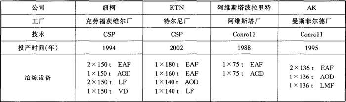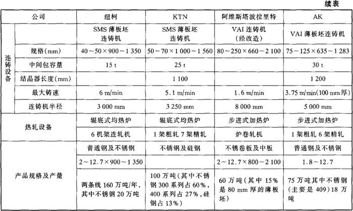 释义 | 薄板坯连铸连轧 薄板坯连铸连轧技术最早用于生产普通钢,目的是将钢水浇注成厚度40~127mm的薄板坯后,直接进行热轧,这样可以省去热轧带钢的粗轧生产工序,降低生产成本,提高产品竞争力。薄板坯连铸连轧技术1988年开始用于不锈钢,主要有奥钢联(VAI)开发的Conro11技术和西马克(SMS)开发的CSP技术,目前有四座工厂采用薄板坯连铸连轧工艺生产不锈钢(见表4-3)。 表4-3 不锈钢用薄板坯连铸连轧设备 最早将薄板坯连铸技术用于不锈钢的是阿维斯塔波拉里特公司的瑞典阿维斯塔工厂,当时该厂将一台普通的不锈钢连铸机由奥钢联公司将板坯最小厚度140mm改造成最小厚度80mm,用以生产高合金钢和不锈钢,目的是提高质量(减少偏析,铁素体分布均匀)和避免二次轧制作业。连铸机改造范围是结晶器、弯曲段、弧形段和矫直段,目前这台连铸机已有15%的钢水浇注成80~100mm×1400~2100mm的板坯,并同炉卷轧机配合批量生产不锈钢卷。美国AK公司的曼斯菲尔德厂,原有2台电炉,一台AOD炉,一套热连轧机(包括一架粗轧、六架精轧),1993年同奥钢联合作采用Conro11技术进行改造,新建LF炉一台,薄板坯连铸机一台,步进式加热炉一台及前后连接辊道,新建的薄板坯连铸机为超低头立弯式连铸机,钢包重量120~160t,中间包容量30t,采用1200mm长的直结晶器,垂直段长2000mm,铸机总长14.6m,铸坯厚度75~125mm。该连铸机出坯辊道(装有保温罩)直接同热连轧机步进式加热炉连接。该步进式加热炉是把薄板坯连铸机同热连轧机连接起来的重要环节,在发生故障时加热炉缓冲时间达1小时。从1995年4月投产以来,已顺利地生产409铁素体不锈钢,最高月产达到1.8万吨,同时板坯表面质量良好,409不锈钢表面废品率小于0.2%。 纽柯公司的克劳福茨维尔厂是世界上最早采用CSP技术生产碳钢的工厂,为了把该技术用于生产不锈钢,1994年增设了一台150吨AOD精炼装置,1995年开始生产铁素体不锈钢(AISI409等),当年生产2.16万吨,目前已达到月产6000~7000t能力,1997年该厂又同SMS集团下属Por-Eco公司签订合同,由其改造原来的酸洗线,使其既能处理普通碳钢又能处理400系列不锈钢,该厂希望最终形成20万吨不锈钢的生产规模,其中409系列9.6万吨,439系列6.4万吨,304系列4万吨,值得注意的是KTN公司所属的意大利特尔尼厂,在其从1992~2000年半工业试验的基础上,于2000年5月决定建设世界上第一台用于生产不锈钢、硅钢和碳钢的CSP工厂,新的CSP铸机的主要参数如下:铸机型式立弯式(VSB),铸坯厚度70/60(mm)或60/50(mm),带液蕊压下,冶金长度9265mm,5个扇形段,浇铸速度5.1m/min(63mm厚时),薄板坯宽度1000~1500mm,其中32%为1000mm,55%为1270mm,13%为1500mm。新的CSP铸机生产的薄板坯通过240m长的辊底式加热炉(使板坯温度均匀)和高压水除鳞设备(压力400bar)直接用现有的热连轧机组生产不锈钢卷,铸机生产能力达100万吨。 特别要指出的是特尔尼厂既能用现有的厚板坯生产,也能用薄板坯生产,热连轧机总生产能力为180万吨,其中150万吨为不锈钢。 |
