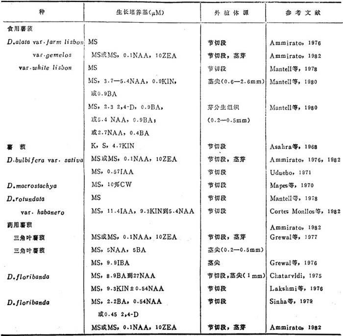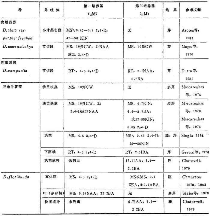 释义 | 薯蓣 薯蓣是薯蓣属(Dioscorea)的一员。生产可食块茎、球茎或根茎,有食用和药用重要性。有600以上种,完全雌雄异株。最近用D.rotundata的育种产生了雌雄同株植物,具有雌花和雄花。改良目标是直立或半直立性、相对短的生长季、产生高产块茎、抗病、皮坚韧、小圆或卵圆形。便于机械收获。高蛋白含量,保持好味道和质地。产生小繁殖体代替插枝大多数种不结籽,植物细胞培养技术有许多重要性。任何栽培品种存在着大量变异,繁殖和推广高产优质个体尤其有价值。诱导增高变异性和选育新特性品系如直立习性和无刺茎,同样重要。 (一)研究进展 1.芽和分生组织培养无性系繁殖 许多种如参薯能用节培养体在温室或大田繁殖。薯蓣属细胞和组织培养的目标之一是利用分生组织培养进行大规模克隆繁殖。 1970年代中期开始研究,腋芽产生植株和促进多芽形成,用于大规模繁殖(表18-4),取得某些成就。大多数成功事例,是利用带有腋芽或芽(每节常有3个芽)和邻近茎和叶柄组织(除去叶)的茎切段取得的。如果切段相对地大(大于1-2cm),常能在基础培养基(通常是MS)上发育成芽和根。如果是茎尖或顶端分生组织,则加生长素和细胞分裂素常是有益的。 种间有差异。Chaturvedi等(1977)指出,与D.floribunda茎插枝相比,三角叶薯蓣(D.deltoidea)的茎切段较难生根。后者在加NAA和IBA培养基上只有50%生根,前者则几乎全都易于生根。就三角叶薯蓣而言,NAA,IBA,2,4-D和氯酸组合能改进生根频率。 细胞分裂素和生长素的特殊类型可能是重要的。虽已证明KIN是D.floribunda节培养体的有效细胞分裂素,Mantell等(1980)发现BA对参薯的茎尖比KIN好。绝对和相对浓度都重要。随着生长素水平增高,有形成愈伤组织的倾向,例如参薯和黄独。低水平生长素加倍根形成。中等浓度细胞分裂素增进芽发育;较高水平通过早先形成的腋芽增高多芽。Chatarveko(1975)在一个第一次试验中,指出将单节插枝培养在加0.5μMNAA和硫酸腺嘌呤培养基上,生了根,然后形成若干块茎组织,长有1或2个芽。培养在加8.8μMBA培养基上的外植体,20天内,平均产生5-6个芽。Mantell等(1978)报道参薯或D.rotundata的一个节段,在3-5周内,将能产生3-5完整植株。每株可分切成3-5个节切段(每个节有一片小叶),移植于新鲜培养基上。14-20天后,发育成新的多分枝再生植株。估计在14-20天有规律循环中,从一个节在6个月内,有可能产生65000再生植株。困难在于每个节切段必须分别切取,并转入新鲜培养基很费事。 一种困难是茎切口使培养基逐渐褐化。重复培养间和品种间反应强度不同,对生长常无影响。有意义的是,Ammirato(1982)研究D.a!ata var.gemelos,单节茎段培养产生植株后,用单节切段再次继代,不出现培养基褐化现象。用于启动初次培养体的茎切段,在转入培养基前,放在加盖培养皿里的水湿滤纸上半小时,似有所助益。培养基加抗氧剂,或低光强以抑制酚类合成,可能是有效的。 Mantell等(1978)首次注意到从不同年龄的蔓上取的节切段,对培养的反应不同。Martin等(1969)曾描述过D.floribunda和黄独不同年龄的蓣薯蔓切段对节切段繁殖的影响。同样,Preston等(1962)指出生长在长日照下的幼株新切段更易产生新植株,并测验了生长在16和12小时光周期下的植株茎切段的反应,生长在较长光周期下植株的切段,芽生长一致。 许多种(表18-4)也从离体茎分生组织发育成完整植株。采用这种技术与高温处理相组合,Mantell等(1980)取得了消除参薯flexous rod病毒成功。分生组织培养体也能用最低生长储存法或深冻保存法储藏种质。Henshaw(1982)用D.rotandata取得成功。 表18-4 薯蓣属的节和分生组织培养 节或分生组织培养产生克隆植株,确能表现高度一致性。D.alata var.gemelos节培养体繁殖的植株,其营养体生长和块茎形成出现一致性。Chatuvvedi等(1982)在一年内从单节茎插枝生产约256万植株。全株保型。 离体芽产生的生根植株的茎芽,经秋水仙素处理,产生了D.flosibunda的四倍体。用浸在0.05%秋水仙素的棉花处理2天,然后除去。30天后,发育成约10株四倍体,与二倍体相比较旺势更强,茎粗壮,叶较大。采用单节叶切段加速繁殖,取得了大量四倍体植株。用于培育D.floribunda三倍体,可能生产更巨大的块茎和较高diosgenin含量。 2.培养中形成块茎 Uduebo(1971)首次报道黄独节插枝,在加低水平生长素IAA的培养基上形成块茎。Ammirato(1976,1982)用黄独和参蓣节切段培养,直接产生块茎。黄独培养在MS基础培养基上,将能形成带根(一条)的单个芽。NAA仰制芽生长,形成块茎。相反,玉米素促进多芽生长。D.alata var.farm lisbon在MS培养基上发生了块茎、芽和根的生长,和形成块茎,加NAA的产生愈伤组织。但是,再加1μMABA形成不带愈伤组织的块茎。Asahira等(1968)报道如果培养基含有NH4+和NO3-,KIN促进节切段的芽生长,但不加NH4+时,抑制块茎形成。 薯蓣属的许多种在它的叶轴上形成小球茎,这常产生于温室内节插枝生根期间。D.foribunda节和分生组织培养体再生植株上也有小球茎形成。 Ammirato(1982)报道D.alata var.gemelos和D.bulbifera var.sativa植株,生长在连续光照下4-5个月后,产生许多气生块茎。这些块茎收获后,或使培养体变干,块茎和干植株可储存6个月之久。一次试验从9瓶中收获到37个块茎。重3-1486mg,长3-32mm。当栽在土中时,90mg长8mm以上的块茎全部出芽,产生正常植株和块茎。 其它属观察到微块茎形成,这种程序成为马铃薯的很重要繁殖方