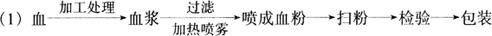 (2)血纤维或全血→蒸煮→脱水→干燥→配料→粉碎→过筛→检验→包装