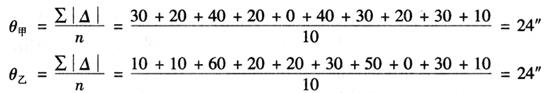 用平均误差衡量结果是:θ甲=θ乙。但是,乙组观测列中有较大的观测误差,乙组观测精度应该低于甲组,但计算平均误差θ反映不出来,所以平均误差θ衡量观测值的精度是不可靠的。 根据数理统计推导可知:某组观测值的中误差m可用下式计算