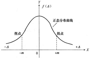 式中 [△△]——各偶然误差平方和; n——偶然误差的个数。 m表示该组观测值的误差,表示任意一个观测值的中误差,并非一组观测值的平均误差,m可以代表该组中任何一个观测值的误差。根据数理统计推导可知,偶然误差与其出现次数的关系呈正态分布,其曲线拐点的横坐标△拐等于中误差m,如图6-1所示,这就是中误差的几何意义。