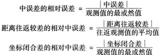 显然,用相对误差衡量可以看出,K1>K2。相对中误差愈小,即分母愈大,说明观测结果的精度愈高,反之愈低。求K的式中分子可以用中误差、距离往返较差、闭合差等,此时相对误差计算式为: