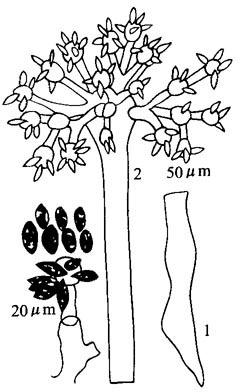 释义 | 西葫芦褐腐病 【释文】: 褐腐病是西葫芦的重要病害。春棚中较常见。一般病株率10%左右,严重的30%以上,对产量有影响。 1.症状识别 病害主要发生在花及幼瓜上。病菌多先侵染已开败的残花。花变褐软腐,病花上产生褐色霉,病菌从花蒂渐向幼果蔓延。被害的幼果从顶部迅速向下腐烂,变褐,病部表面产生灰白色至黑褐色茸毛状霉层。空气干燥时,病瓜褐色干腐。一般幼瓜易受害,烂瓜有时具臭味。病害严重时,成熟的瓜也受害,病瓜局部变褐腐烂。 2.病原菌及传播途径 病害是由接合菌亚门瓜笄霉真菌侵染而致。病菌菌丝发达,有分枝,一般无隔。孢囊梗即分生孢子梗不分枝,直立在寄主上,无色透明,顶端膨大如大头针状,头状体上有许多小梗。小型孢子囊聚生在小梗上,椭圆形或纺锤形,表面有饰纹,其中只形成1个孢子即分生孢子。条件不宜时形成大孢子囊,着生在顶端弯曲的孢囊梗上,圆形,有球形囊轴,其中产生多个椭圆形孢囊孢子。孢子两端有数根细毛,表面光滑(图2-12)。病菌主要以菌丝体随病残体或产生接合孢子在土壤中越冬。条件适宜时,侵染花和幼果,产生大量孢子,借气流和浇水、施肥等作业传播。病菌除侵染西葫芦外,还侵染南瓜、西瓜、冬瓜、茄子、甜椒、豇豆等。 图2-12 西葫芦褐腐病菌 1.孢子梗 2.分生孢子及其着生状(李明远图) 3.发病条件 棚室低温高湿,浇水过量,或连续阴雨,光照不足,或过于密植,植株郁闭,生长势弱,病害易发生流行。 4.防治方法 (1)轮作 与非寄主植物实行3年以上轮作。 (2)栽培管理 高垄栽培;合理浇水,防止大水漫灌,合理密植,注意通风透光;坐果后及时摘除残花、病果、集中深埋或烧毁。 (3)开花坐果期药剂防治 方法同黄瓜霜霉病。 |