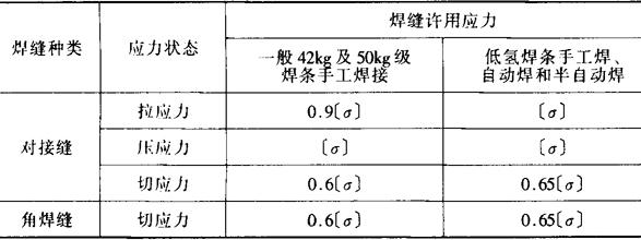 释义 | 角焊缝静载强度计算公式 国际焊接学会(IIW)推荐的角焊缝静载强度计算公式为: 式中 σ折——角焊缝计算断面上的折合应力。 β——因母材屈服点σs而异的系数, 当σs=240MPa时,β=0.9; σs=360MPa时,β=0.85。 其他σs值用线性内插法确定。 σ⊥——垂直作用于计算断面上的正应力。 τ⊥、τ∥——分别垂直和平行于焊缝长度作用于计算断面上的切应力。 〔σ′l〕——焊缝金属许用应力,按表13-9确定。 表13-9 按基本金属许用应力确定的焊缝许用应力 注:1.表中〔σ〕为基本金属的拉伸许用应力。 2.上表适用于低碳钢及50kg级以下的低合金结构钢。 用这个计算公式作角接头强度计算虽然复杂一些,但结果比较接近实际。 |
