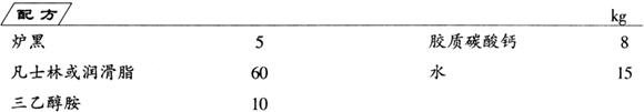 在水中依次加入三乙醇胺、凡士林或润滑脂、炉黑、胶质碳酸钙,充分搅拌,混合均匀,即成产品。