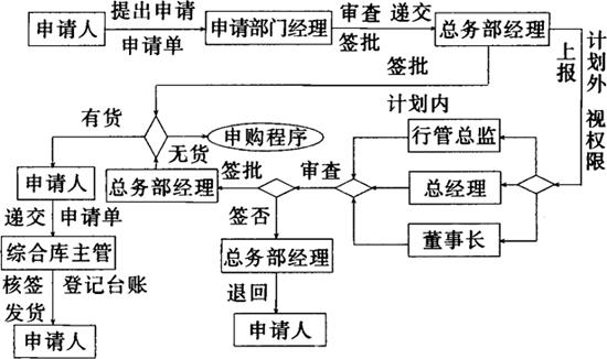 释义 | 计划外办公用品审批发放流程 说明: 1.本流程只适用于计划外办公用品的审批发放,计划内的则按照相关制度执行。 2.申请人填写办公用品申请单,由总务部经理审查、签批后。 3.如在计划内则签批,有货则直接到综合库领取,无货则进入申购程序。如属于计划外,则根据金额和权限转交总经理或行政总监批准。 4.总经理(或行政总监)审查签批后,如有货则直接到综合库领取,无货则进入申购程序。 5.如果总经理(或行政总监)审查后签否,则由总务部经理将申请单退回给申请人。 |