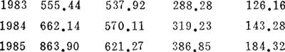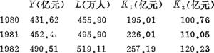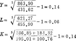 释义 | 计算举例 以某省1980~1985年的数据为例: 利用水平法分别计算出1980~1985年间的Y,L,K值如下: 连同β=0.5代入(6-3)式得: a=Y-0.5L-0.5K=0.14-0.5×0.06-0.5×0.14=0.04 即在1980~1985年间,某省科技增长速度为4%。这期间科技进步在工业增长中的贡献份额为: |