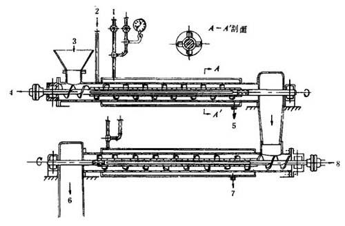 释义 | 设备 预混用的设备主要是装有蒸汽夹套的机械搅拌机(也称为捏和机),大致可分为低速搅拌机、高速搅拌机和管道式搅拌机三种。目前常用的是前两种,由于低速搅拌机生产效率低,劳动保护差,故不常用,一般趋向于高速搅拌机。 (一)低速搅拌机 这类搅拌机有Z形搅拌机,∑形搅拌机,螺带式搅拌机等等,其搅拌桨叶的结构形式虽有不同,而搅拌效率基本相同,均属于低速、低效、开放式间歇操作的搅拌装置。现以Z形搅拌为例说明如下。该种装置的主体是钢槽,槽底为两个半圆形,内衬不锈钢,槽体装有夹套可通蒸汽加热或冷却,槽壁两边近底部装有一对相反转动的Z形搅拌桨(见图3-2-2),其主轴转速一般为20~40r/min,副轴为10~20r/min,速比大致是221。Z形搅拌桨见图32-3。搅拌浆也可以是其它形式,见图3-2-4。 图3-2-2 Z形搅拌机示意图 图3-2-3 Z形搅拌桨 图3-2-4 搅拌桨型式 (二)高速搅拌机 主体部分是一个密闭的圆筒式容器,如图3-2-5所示,容器底部有两片高速旋转的搅拌桨,其转速因规格型号不同而不同,一般分高速和低速两档,高速为750~1100r/min,低速为400~750r/min。物料由下叶搅拌桨使之沿容器壁急剧散开,而向上叶搅拌桨中心部位下落,形成旋涡状运动,以达到迅速混和均匀,刮料板(也称折流板)是为便于物料作均匀分散而设的,可作角度和上下调节,在高速搅拌下,物料因内摩擦和搅拌桨、容器壁摩擦所产生的热量,以及夹套中蒸汽传入的热量,致使增塑剂能很快地渗入聚氯乙烯树脂,形成半凝胶化的干混料。物料完成混和后通过卸料管排出。这种搅拌装置具有效率高,混和均匀,热量耗用低,密闭性好等优点,故目前在聚氯乙烯加工中普遍应用。 图3-2-5 高速搅拌机示意图 1-电动机 2-热电偶 3-刮料板 4-测料温热电偶 5-捏和盖子 6-蒸汽夹子 7-主轴 8-活塞操作的闸门 9-气缸 10-卸料斜管 11-轴封 12-密封圈 13-轴承管 14-机架 15-V型皮带调节装置 (三)管道式搅拌机 主体是由两段Φ125×1400mm的混合管串联组成,管内配置一根多翼转轴,转轴由变速电动机带动,以1000r/min左右的高速旋转。翼片角度分正反两个方向。混和管外配置蒸汽夹套加热。混和时,物料在管内受到加热和剧烈的剪切,从而能迅速地被搅拌均匀并连续地被制为干混料。管道式搅拌机见图3-2-6。 图3-2-6 管道式搅拌机示意图 1-蒸汽 2-大混和料 3-PVC树脂 4-接电动机 5-冷凝水出口 6-捏和料 7-冷凝水出口 8-接整流子电动机 (四)搅拌机的特征 常用的高速搅拌机和Z形搅拌机的优缺点见表3-2-1。 表3-2-1 高速搅拌机和Z形搅拌机的对比 |