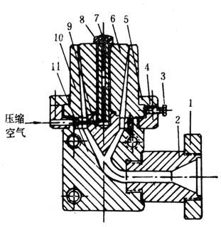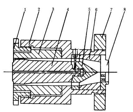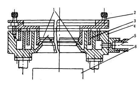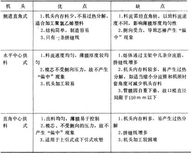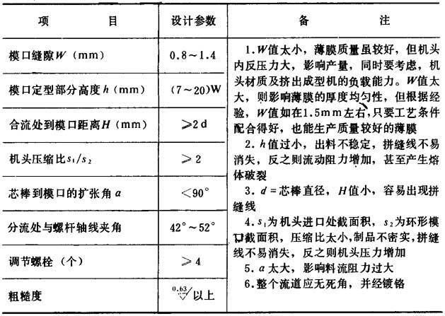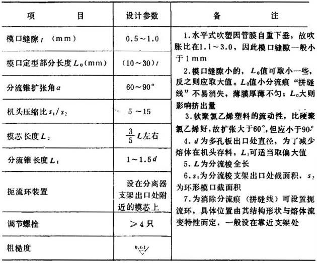 释义 | 设备 (一)挤出成型机 挤出成型机主要根据吹塑薄膜的规格和生产量来选用,目前一般使用螺杆直径为30~90mm的单螺杆挤出成型机,生产宽幅薄膜时可采用Φ150mm挤出成型机,螺杆是等距不等深的渐变型的,长径比≥20,压缩比2.5~3.5。挤出成型机的大小与口模口径配合的关系,参考表4-4-3。 表4-4-3 挤出成型机大小与口模直径关系(mm) (二)机头 机头是吹塑薄膜成型设备的一个重要部件,它的设计合理与否直接影响加工工艺和产品质量。通常用于聚氯乙烯吹塑薄膜的机头有:侧进直角式(芯棒式)、水平中心供料式(直通式、支架式)和直角中心供料式(支架式)三种。不论哪一种吹膜机头,都要求模口各点出料均匀,因此,如设计合理,应均能制得质量较好的聚氯乙烯吹塑薄膜。现将三种机头分述如下。 1.侧进直角式(芯棒式)机头 这是聚氯乙烯吹塑薄膜中常用的一种机头,如图4—4—4所示。熔体从分流板挤出,通过机颈到达芯棒,沿着芯棒分流线至芯棒对面汇台成与螺杆轴线成垂直的环形料流。这种机头因熔体在流道内需作直角转弯,在转弯处靠近机身处的熔体流动距离小于芯棒对侧的熔体流动距离,因而影响口模各点的料流均匀性,导致薄膜不匀。再则由于侧面进料,故当熔体牯度过大或进料过多对,芯棒因侧向受力过大而变形,产生“偏中”现象,引起环形模口缝隙不匀,同样也会造成薄膜厚薄不匀,因此在考虑芯棒直径时,在不影响其它因素的情况下,予以适当放大或选用刚性好的钢材。 图4-4-4 侧进直角式机头 1-六角螺母 2-垫圈 3-口模压板 4-螺栓 5-口模 6-内六角螺钉 7-芯模 8-口模套 9-机头套 10-芯棒 11-联接轴 12-螺栓 13-垫圈 14-螺母 芯棒上分流处也称之为斜刀口,其形状和其对螺杆轴线的夹角,对熔体的粘度与流速影响很大。夹角一般在45~52°。芯棒上合流处的形状(也称之为斜刀口顶点),如过尖,容易造成薄膜在这点出现一条厚的条纹,而条纹两侧较薄;如圆弧较大则薄膜容易产生一条特别薄的拼缝线,并出现一滞流点,促使树脂过热分解。要解决这些问题,应根据物料特性,通过试验加以修正,才能取得满意的芯棒结构。 侧进直角式机头的经验设计参数见表4-4-4。 表4-4-4 经验设计参数 2.水平中心供料式(直通式、支架式)机头 这种机头适用水平式吹塑薄膜,如图4-4-5。其结构基本与管材挤出的直通式机头相似。熔体通过多孔板之后,经圆锥形分流梭均匀地通过模芯挤出。分流梭由支架支持(参见本章第二节),压缩空气由支架中一条“分流筋”上的小孔经模芯通入管膜。支架“分流筋”的数在强度足够的前提下应尽可能少而薄,目前一般“分流筋”的筋数为3~5根。机头的经验设计参数见表4-4-5。 图4-4-5 水平中心供料式机头 1-压紧螺母 2-模体3-模口 4-模芯 5-分流梭 6-垫圈 7-法兰 8-滤板 表4-4-5 机头经验设计参数 3.直角中心供料式(支架式)机头 这是结合上述两种机头的特点,由挤管机头演变而来的,如图4-4-6所示。熔体通过多孔板之后,经过直角流道主锥形分离器,均匀地通过模芯挤出。这种机头用于上引式或下引式吹塑时,可以在一定程度上弥补侧进直角式机头料流不均匀的缺点,但直角弯通的机械加工困难,光洁度较差。 图4-4-6 直角式中心供料机头 1-法兰 2-机头联结器 3-调节螺钉 4-口模套 5-口模压模 6-芯模 7-连接杆 8-螺母 9-分流梭 10-口模 11-模体 表4-4-6 三种机头的优缺点比较 (三)辅助装置 1.冷却装置 薄膜的冷却是一个重要的问题。冷却不足,挤出成型机的生产能力就会受到限制,并影响薄膜的透光度与光泽度,有时在夹辊的压力下薄膜还会出现粘连现象;如冷却不均匀还会使薄膜厚薄不匀。故在薄膜吹塑成型中对冷却装置应予注意。冷却方法有外冷法和内冷法两种:外冷法结构简单,操作方便。最常用的外冷法是风环冷却法。内冷法冷却效果较好,能显着提高生产能力,但结构复杂,常用于聚烯烃重包装吹塑薄膜的生产。现将冷却装置简述如下。 (1)风环 常见的风环结构如图4-4-7。风环至少有三个,压缩空气沿风环切线方向同时进入。风环中所设置的几层挡风板能使出风均匀并起到缓冲作用。风环内径可按模口直径加大150~300mm设定,小口径取小值,大口径取大值,出风口的间隙为1~4mm,可用螺栓调节风量大小。出风口与管膜挤出平面的夹角为45~60°。在薄膜生产线速度为5m/min左右时,配以风量为5~10m3/min,功率为0.71~1.1kW的离心风机就能达到薄膜的冷却要求。如能对风速进行控制,则更为合理。风口间隙为2mm时,风速约为15~20m/s。除了采用风冷之外,也有以喷雾方式或通入二氧化碳以提高冷却效果的。 图4-4-7 风环结构示意图 1-出风口 2-调整螺钉 3-挡风板 4-风环 5-进风口 6-机头 (2)减压室冷却风环 这种风环是在上述普通风环的上部增加一个减压室如图4-4-8。在风环的空气出口处设有气流转向板,使气流沿管表面平行流动。在风环上部设有带节流间隙的简单装置。气流沿膜泡表面向上流动时可使此装置内形成减压,故称为减压室。膜泡通过此减压室时,有助于均匀地吹胀并提高冷却效果。同时,如管膜直径(即吹胀比)发生变化时,则减压室出口处膜泡周围的间隙也随之增大或减小,风机的背压也随之而异,致使减压室的减压程度就随膜泡直径增大而减小,膜泡直径减小而增大,管膜泡的吹胀比逐能自动回复原状,起到自动调节吹胀比的作用。 图4-4-8 减压室冷却风环示意图 (3)水环 冷却水