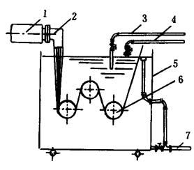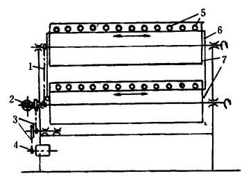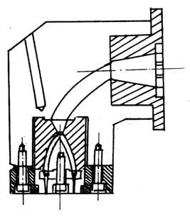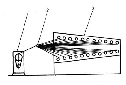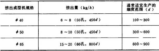 释义 | 设备 (一)挤出成型机 用作挤出单丝的挤出成型机通常是直径为40~65mm的单螺杆挤出成型机。主要技术参数和单丝细度范围见表4-5-1。 表4-5-1 挤出成型机主要技术参数 表4-5-2 挤出成型机规格与参考挤出量 挤出单丝时,应设有过滤板和过滤网,主要作用是增加螺杆背压,提高塑料熔体在组成与温度两方面的均匀程度和去除不熔的杂质。这对单丝挤出非常重要,因为单丝是一种比较纤细的制品,又是多根同时挤出,如果熔体均匀程度不好或含有不熔杂质,则不仅影响制品的质量,同时还可能由于单丝断头而影响操作。过滤板的孔径取喷丝孔直径的两倍为好,过滤网为60~100目的金属丝网(最好是不锈钢丝网),由2~3层组合而成。 (二)机头 组成机头的主要部件是模体、分流梭和喷丝板,参见图4-5-2,4-5-3和4-5-4所示。生产单丝主要用直角机头。 图4-5-2 直角式机头 图4-5-3 分流梭示意图 图4-5-4 喷丝板示意图 1-喷丝板 2-连接板 3-倒锥角 4-喷丝孔 1.直角机头 图4-5-2所示系生产单丝常用的一种直角下引机头。在分流梭前的流道外设计成“瘦颈”以增加料流阻力,使熔体均匀流经分流梭至喷丝板;其次是缩短了弯头处流道,使存料减少以避免塑料分解。生产单丝时,熔体在各喷丝孔中的压力须保持恒定和均匀,以免出料波动而使单丝粗细不一,故所设计的机头,其流道截面积应逐渐减小,以使料流具有一定的阻力。 2.分流梭 分流梭的锥角不宜过大,否则容易形成滞流,导致物料的分解,一般取30~80°,其表面应力求光滑,阻力要小,分流梭与模体构成的环隙流道截面积应大于喷丝孔截面积的总和。 3.喷丝板 喷丝板通常用钼钒钢(24CrMoV)、锰钒钢(25Mn2V)或铬钢(15Cr)制成。其结构见图4-5-4所示。喷丝板上出料孔呈环状排列,其孔数一般为20~60,但须视挤出成型机和处理能力等具体情况而定。孔与孔之间的距离应相等且不能太小。太小时,不仅对引丝不利,而且喷丝板的强度也会受到影响。 由圆柱形模头理论挤出公式,得知料流量与喷丝孔半径的四次方成正比。因此如果喷丝孔直径有10%的误差,则流量的误差能达47%,这在挤出工艺上想由机头或牵引的调整得到补偿是不容易的,所以喷丝孔的制造必须具有很高的精度,要求各孔的中心距、孔径、平直部分长度及倒锥角均一致。 由于从机头挤出的单丝还须在轴向上进行2~2.5倍的牵伸,所以喷丝孔的直径总是比制品的直径大,两者之间的关系见表4-5-3。 表4-5-3 聚氯乙烯喷丝孔孔径(mm) 为克服塑料熔体的粘弹性并在流动时具有一定的阻力,喷丝孔应有一定的长度,通常为孔径的4~10倍。喷丝机头部应做成倒锥形作为入口区,倒锥角的角度一般取60°。 (三)辅助装置 1.冷却水箱 由喷丝孔挤出的熔融单丝以适当的牵伸速度(冷却后的单丝直径基本与喷丝孔孔径相同,或根据经验,第一对牵伸辊的线速度与喷丝孔挤出速度之比为2.5左右),进入冷却水箱予以迅速冷却,冷却水箱见图4-5-5,其具体尺寸应视牵伸速度而定,一般长1~2m,水深1m左右,单丝在冷却水箱内通过的行程在1m以上,水面与喷丝板的距离小于50mm,为便于操作,水箱中的导向滑轮能够升降。 图4-5-5 冷却水箱结构示意图 1-挤出成型机 2-机头 3-蒸汽管 4-冷水管 5-水箱 6-导向滑轮 7-溢流及排水管 2.牵伸装置 牵伸装置一般由三对辊筒和二个热水槽所组成。每对辊筒的直径为150~200mm,长200~3OOmm,表面镀铬,上下排列,中心距约4OOmm,轴倾斜度为6~12°,上辊为主动辊有整流子电机或可控硅控制调速。热水槽长度一般为2~4m,装有蒸汽管或电热棒。热水槽和导向辊用铝或不锈钢制造,以防腐蚀生锈。冷却后的单丝由第一对牵伸辊(绕5~10圈防止单丝在牵伸中打滑)经第一个热水槽进入第二对牵伸辊(绕5~10圈)时.由于第二对牵伸辊的线速度大于第一对,单丝递被拉伸,然后经第二个热水槽(热处理定型,温度比第一个高2~3℃)进入第三对牵伸辊(速度比第二对降低5%左右),使牵伸取向后的单丝的内应力松弛并收缩定型,而后即被送入分丝卷取装置。 牵伸也有用多辊的,如图4-5-6所示。从第一辊到最后一个辊的直径依次放大约1%,使单丝张紧,在第二对牵伸辊拉伸时,不至于打滑。 图4-5-6 牵伸装置 图4-5-7 分丝卷取装置 1-第二牵引辊 2-分丝辊 3-卷取装置 3.卷取装置 卷取装置由卷取筒和卷取轴所组成。为使单丝均匀、平整地绕在卷取筒上,一般借用凸轮排丝。 卷取方法有两种,一种是将几十根单丝分开,每根单丝卷取在一个筒子上,每卷重约1kg见图4-5-7所示;另一种是将几十根单丝合股卷取在一个筒上,每卷重5~8kg,然后用分丝机将复丝分成单丝。也有不分丝而直接将复丝捻丝制绳的。分丝机结构见示意图4-5-8。。 图4-5-8 分丝机结构示意图 1-链条运动 2-凸轮 3-皮带运动 4-电机 5-分丝环 6-分丝排线架 7-分丝架 |