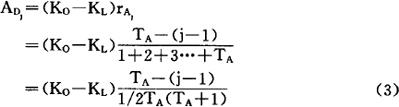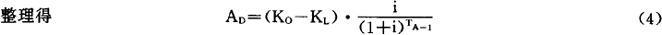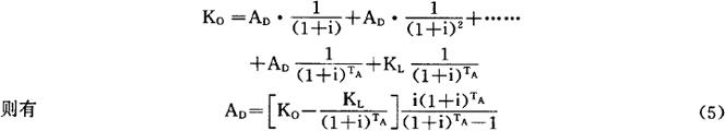 式中,ADJ——设备在第j年度的折旧额; rAJ——递减系数,即第j年的折旧率; j=1,2,……,TA。 (2)双倍余额递减法 按直线折旧法残值为零时的折旧率的两倍计算,逐年的折旧基数等于设备原值减去累计折旧额。为了使折旧总额在设备使用期终分摊完毕,到一定年度后,要改用直线折旧法。改用直线折旧法的年度根据设备使用年限而定。当设备使用年限为奇数时,该年度为 3.复利法 复利法可分为偿债基金法和年金法。 (1)偿债基金法 在设备使用期限内每年按直线法提取折旧,同时计算利息。每年提取的折旧额加上累计折旧额的利息与年度的折旧额相等。到设备报废时,累计折旧额及利息之和与折旧总额相等。到设备报废时,累计折旧额及利息之和与折旧总额相等,即正好等于设备的原值。 按照直线折旧法,如每年提取的折旧额为AD,利率为i,使用年限为TA,则历年提取的利息为: 第一年 AD(1+i)TA-1 第二年 AD(1+i)TA-2 ……第AD年 AD(1+i)TA-TA=AD 则 AD(1+i)TA-1+AD(1+i)TA-2+……+AD=KO-KL