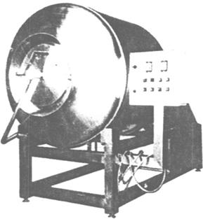 释义 | 设备结构与工作原理 立式滚揉机如图3-5-8所示。 图3-5-8 立式滚揉机 优质不锈钢制的肉槽制成多边形或圆形,中间装有两个搅拌轴,轴上配有10个倾斜的桨叶,由于旋转速度较慢(3~13r/min),肉受桨叶机械能的挤压滚揉起到按摩作用,从而加快盐水吸取速度,增强蛋白质萃取力与水分的保留,改进并取得最佳的腌制效果,更密更强的滚揉能使制品出品率大幅度提高。立式滚揉机变速电机设在槽体上,通过齿轮带动桨叶轴自转,滚揉按摩好的肉从下部出料门排出。滚揉机的容量不大,大型企业一般均需同时使用多台设备,如图3-5-9所示。 图3-5-9 多台滚揉机 滚揉机的桨叶设计十分重要,根据受力理论有方型、钻石型、垂直型、水平型多种,图3-5-10为方形结构。 图3-5-10 滚揉机方形桨叶结构 使用真空滚揉装置的目的是为了减少滚揉强度和时间,主要用于提高制品品质,而不是以提高出品率为基本考虑因素而设计的。真空滚揉机的结构如图3-5-11所示。 图3-5-11 真空滚揉机 国产ZGR型真空滚揉机的卧式滚筒筒体前面设有端盖,在中心位置处装有旋转导气管接头,连接筒内垂直向上的吸气管,它可防止肉沫吸入真空泵。另一端与XD-063型真空泵连接,当真空泵启动后,筒内形成真空。筒体后部设有变速转动装置,筒体在旋转状态下连续抽真空。控制面板上装有筒体及真空泵,启动、停止、出料等按钮,电动总开关,指示灯,真空表和三只定时器。只要按工艺要求设定时间为自动正转-暂停-反转-暂停-正转循环自动运行,达到总时间设定值时,机器就会自动停车。 进料采用真空吸入,只要将肉车与筒体进料口之间用快速接头接上吸料管,盖上端盖,开启真空泵,即可将肉料吸入筒内。自动出料时,只要打开真空阀,打开端盖,将桶车接于出料口下方,按控制板上出料按钮,滚筒反转即可自动将肉料送入桶车。滚筒及肉料全部重量借两对耐磨尼龙1010制造的滚动托轮支撑。当滚筒转动时,筒内桨叶强烈挤压,使肉块表面的肌肉组织间相互摩擦摔打,而不出现整块肉的翻转运动,从而使盐溶的蛋白质渗出,旋转的次数越多,肌肉组织相互摩擦越多,提取的盐溶蛋白质也越多,它在肌肉组织间起到胶水样的作用,在肌肉表面形成一种黏性薄膜而起到保水作用。 |
