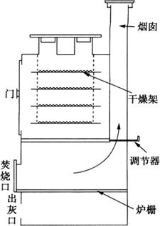 图3-6-4 直接火式自然换气干燥室 间接加热干燥设备的干燥室结构基本上与直接火式相似,不同之处在于燃烧炉产生的烟道气先加热加热器(锅炉或金属管等),室内空气被间接加热后产生对流,湿气从上部排出,虽然热效率较低,但比较干净卫生。为方便换盘,固定盘架可改为盘架小车从侧面推入。有的工厂使用蒸气热源则更为合理。 (二)热风干燥设备 热风干燥设备是一种强制循环送热风的干燥方法,设备型式较多,有强制循环干燥机(图3-6-5)、隧道式干燥设备(图3-6-6)、多层网带式干燥机等。