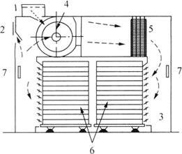 图3-6-5 强制循环干燥机 1-空气过滤器 2-调节器 3-干燥室 4-送风机 5-加热器 6-干燥台车 7-温度计