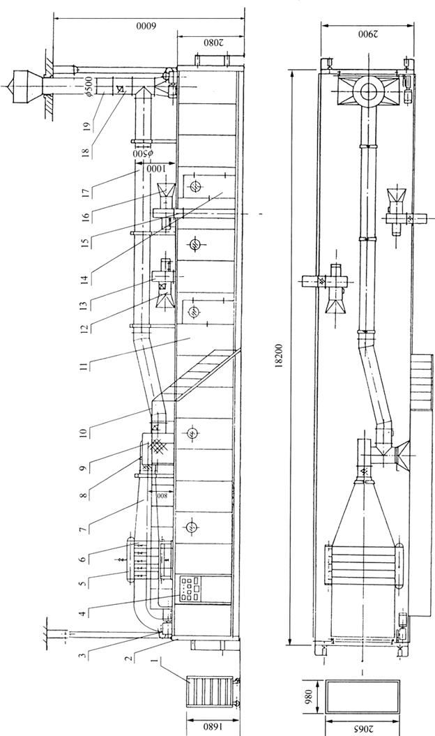 图3-6-10 连续网带式远红外线干燥设备 图3-6-11所示连续式远红外线干燥机的隧道结构中两侧设置板式远红外线辐射器,上部设有运输物料的吊轨,体积较大的物料挂在吊轨上借传动装置向前移动,顶部设有循环风管和排气管,可根据工艺要求调节。排气及循环风通过风机实施。