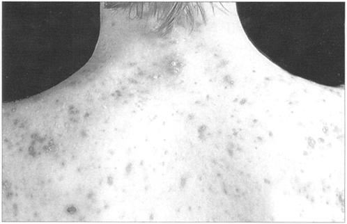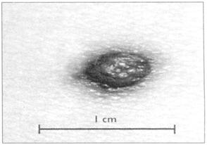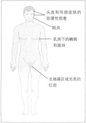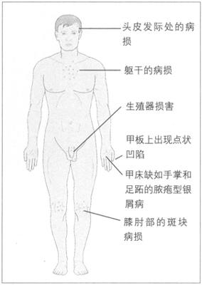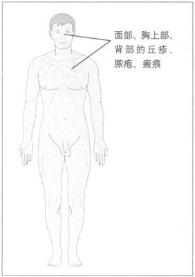 释义 | 评估和诊断 皮肤科的病史采集与其他系统相似,不过皮肤的病变常可归结为某种基本病变,可作为诊断的突破点。 10.2.1 病史采集 1.病人主诉 病人可能自述有“皮疹”、“斑点”、“瘙痒”、“溃疡”或“有肿物生长”。让病人准确描述他们所论及的病变及其分布是很重要的。还应询问加重和缓解因素如冷、热、温和干燥等情况。应询问: ●“病变是快速进展还是缓慢进展的?” 虽然困难,但弄清病变的出现时间还是非常重要的,尤其是皮肤肿瘤。病变出现后的变化情况也很重要,是从边缘扩散到中心,还是从中心扩散到边缘,是种植性生长还是时有时无。 2.既往史 应询问病人以前是否患皮肤病,因为皮肤病从一出生就可以出现。 3.社会史 患皮肤病时,询问病人的职业很有必要,因为有几种工业上使用的化学物会刺激皮肤导致过敏。应牢记皮肤过敏也可因接触宠物产生,植物抗原也可以导致皮疹。询问光照史也很重要。短期暴露于阳光下可出现光敏性皮疹,有时伴有药物反应。长年反复暴露于阳光下易患口腔溃疡、鳞状细胞癌、恶性黑色素瘤。 4.家族史 有湿疹的病人应了解有没有家族特异性。对于有银屑样皮疹疑诊为银屑病的患者,询问家族成员有无银屑病也很重要。其他一些少见的皮肤病也有家族倾向,如迟发性皮肤卟啉病。 5.药物史 了解病人使用了什么药,用了多长时间至关重要。很多皮疹是由药物引起的。应该清楚有些药物可在使用几个月后才出现皮疹,如类风湿性关节炎病人使用的针剂和青霉铵。 10.2.2 查体 皮肤检查主要靠视诊。应准确判定损伤并做相关描述。任何继发病变如抓痕都应做出判定和描述。应准确记录损伤的形态、大小、颜色和构成,注明其分布。进行常规查体也很重要,因为皮肤病变通常是全身异常的一部分。 10.2.3 皮肤病变的关键特征 应特别注意不要漏诊有恶变倾向的痣。其特点为:形态改变;颜色不均;大于1cm;有出血;瘙痒。 请看良性色素痣(图236),不典型痣(图237),恶性黑素瘤(图238),基底细胞癌(图239)的病变。 图236 良性色素痣 图237 不典型痣 图238 恶性黑色素瘤 图239 基底细胞癌 10.2.4 体征的图示 这部分包括常见皮肤病的临床图片:白癜风(图240);特应性湿疹(图241);肘部银屑病(图242);足底银屑病(图243);痤疮(图244);高胆固醇血症导致的黄色瘤(图245);系统性红斑狼疮的蝶形红斑(图246);血管炎时的皮疹(图247)。 图240 白癜风解剖 图241 特应性湿疹 图242 附部银屑病 图243 足部银屑病 图244 痤疮 图245 黄色瘤 图246 系统性红斑狼疮的蝶形红斑 图247 血管炎皮疹 皮肤病变的一般性定义 皮肤病学与其他学科一样,有自己的一些描述用语。幸好这些术语不多,而且很容易记。 A斑疹——是局限性皮肤颜色改变,损害与周围皮肤平齐,如雀斑。 B丘疹——超出皮肤表面的圆形病损。 结节-指达到皮肤深层的肿块。 C鳞屑——为脱落或即将脱落的扁平角质细胞。 D痂——指达到皮肤深层的充满液体的腔隙。 E裂隙——皮肤裂口。 F糜烂——表皮或粘膜部分缺损的区域。 G溃疡——表皮或粘膜的上皮全部缺损的区域。 H萎缩——皮肤变薄。 l苔藓样变-皮肤增厚。 J水疱——指小的囊疱,如单纯疱疹。 大疱——含有清亮液体的疱疹。 水疱和大疱可位于表皮下,如类天疱疮和疱疹样皮炎,也可位于表皮内,如天疱疮和湿疹。 K抓痕——深及真皮层的抓伤。 L斑块——皮肤局限性的一致性的增厚,界限清楚,表面部分平坦或粗糙,如银屑病。 M粉刺——毛囊漏斗过度角化而形成。 N红斑——皮肤发红。 下图显示常见皮肤病病损的分布:银屑病(图248)、痤疮(图249)、脂溢性皮炎(250)。 图248 银屑病 图249 痤疮 图250 脂溢性皮炎 (田雨 李航宇 译) |