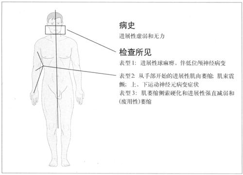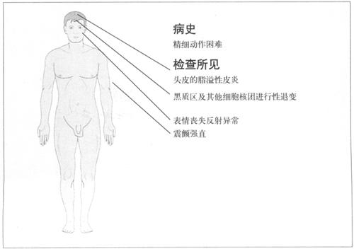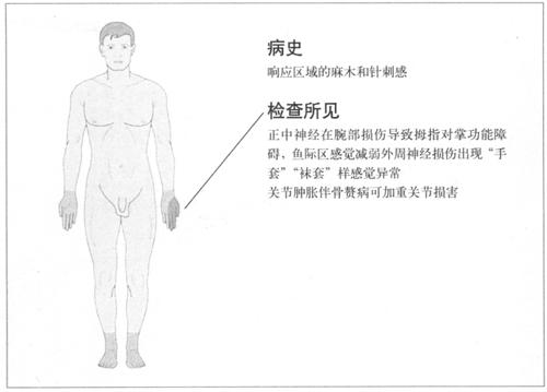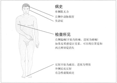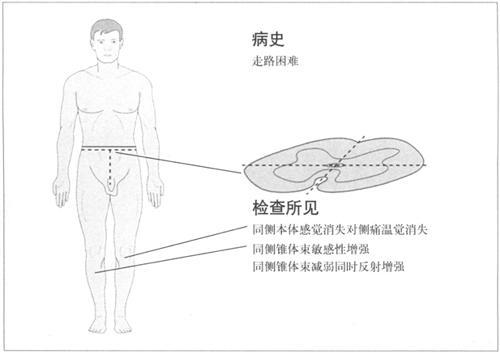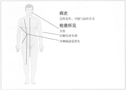 图187 腰穿 腰穿过程 ●病人的正确体位对穿入蛛网膜下非常重要,确保病人尽量舒适和放松。病人向左侧卧,右侧朝上,背向床缘,颈部放松屈曲,双腿弯曲,膝间垫枕、背部垂直。 ●穿刺之前,检查所有设备正常并能正常装配。包括穿刺针、针芯、压力计和收集管。确保针芯能严密进入穿刺针,直达底端。第一解剖标志是髂前上棘,其间垂直线为腰3~4,脊髓止于腰1~2,所以这一间隙或其上或下均可穿刺。 ●棘突位于椎间隙之上,椎间隙在棘突下1cm。用2%利多卡因局部麻醉,用25号针(橙色)穿过皮下,换21号针(绿色),继续刺入更深水平,注意在注射之前回抽以防误入血管。 ●局麻起效后,穿刺针以90°垂直刺入背部,与头部在矢状面上同一水平,穿刺针首先经过棘上韧带的阻力,在5cm深度到达黄韧带,在此水平进一步就进入蛛网膜下腔,拔出管芯时可流出清澈无色的脑脊液。 ●当脑脊液流出通畅时,可用压力计接在穿刺针上测量压力,来自压力计的脑脊液收集入第一管,之后直接滴入第二,第三,第四管和血糖管。重置入针芯,拔出穿刺针,结束腰穿后病人平卧24h,如果病人头痛则需要仔细护理,可予止痛药物如扑热息痛。 2.关键的实验室检查 神经病学以解剖为基础,故影像学检查非常重要,CT和磁共振是神经学检查的必要部分。这些技术最好与神经影像学相结合。 下列图简释了中枢神经系统疾病的特点:外侧髓质综合征(图188),脑缺血(图189),脊髓外伤(图190),周围神经病变(图191),帕金森病(图192),运动神经元病(图193),脑干卒中(图194)。