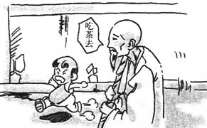 唐朝有位高僧从谂禅师(778~863),俗姓郝,常住在赵州观音寺,人称“赵州古佛”。从谂嗜茶成癖,每次说话之前都要带句口头禅“吃茶去”。据《广群芳谱·茶谱》引《指月录》道:“有僧到赵州,从谂禅师问:‘新连曾到此间么?’曰:‘曾到’。师曰:‘吃茶去。’又问僧,僧曰:‘不曾到。’师曰:‘吃茶去。’后院主问曰:‘为甚么曾到也云吃茶去,不曾到也云吃茶去?’师召院主,主应喏,师曰:‘吃茶去。’”佛教崇尚饮茶,有“茶禅一味”之说,因此赵州从谂的这一口头禅极易流传,成为佛教界的一句禅林法语,又称“赵州法语”。