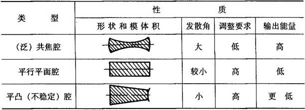 谐振腔是光学反馈元件.它的作用是使光放大介质产生光振荡,谐振腔的类型对激光输出能量和光束发散角有重大影响.表2-1是几种常用谐振腔的性质比较.