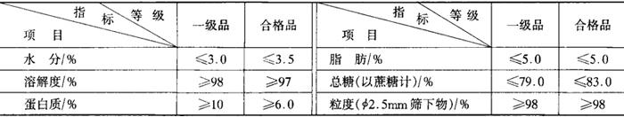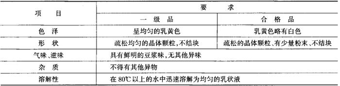 | 释义 | 豆浆晶(摘自ZBX11014) (一)主题内容与适用范围 本标准规定了豆浆晶的定义、技术要求、检验方法、检验规则和标志、包装、运输、贮存。 本标准适用于以大豆、蔗糖为原料,而制成的固体饮料。 (二)术语 豆浆晶是以大豆、蔗糖为原料,经磨浆、浓缩、干燥等工艺制成的晶状颗粒,是一种具有豆浆风味的速溶固体植物蛋白饮料。 (三)技术要求 1.质量分级 产品分为一级品与合格品两个等级。 2.感官指标 见表5-2-63。 表5-2-63