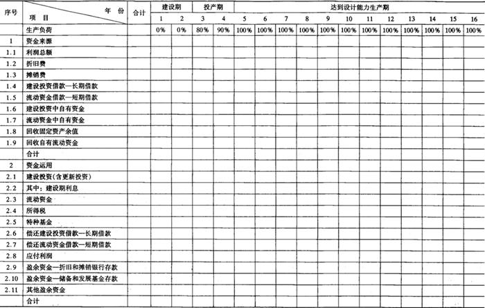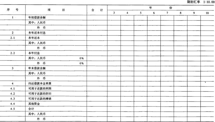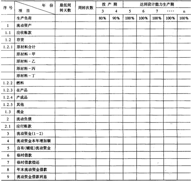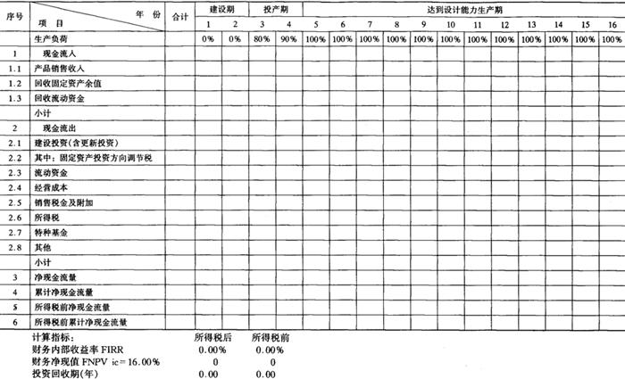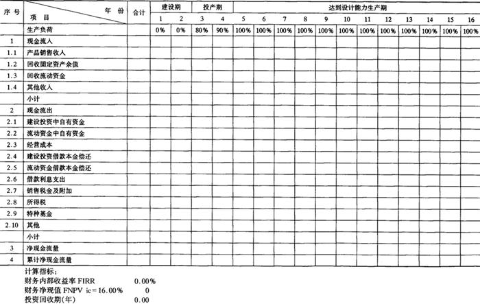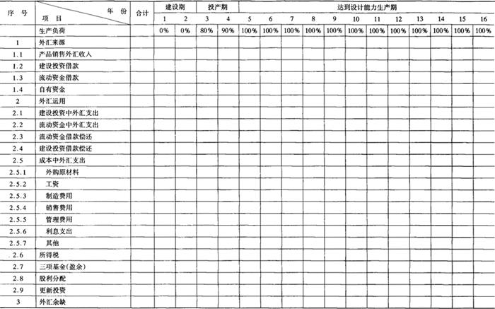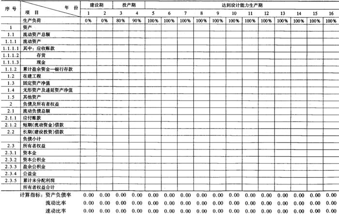 释义 | 财务评价报表 财务评价报表主要有以下16种,分别参见表6-11-1~表6-11-16。这些报表及计算项目,可以根据具体情况进行增删。 表6-11-1 全厂定员及人员构成分析表 注:(1)季节工列出年平均人数,并在备注栏内注明雇用月数。 (2)改建、扩建项目可增加“原有人数”和“新增人数”栏。 表6-11-2 车间(部门)定员明细表 注:(1)轮休等人员列入“预备”栏内。 (2)不设计量机构的专职计量人员列入有关车间部门中。 表6-11-3 分年度用款计划表 单位:人民币:万元;外币:万美元 表6-11-4 建设期借款利息估算表 单位:人民币:万元;外币:万美元 注:人民币年利率 0.00% 资本金与建设投资比例按:20.00% 外币年利率 0.00% 表6-11-5 流动资金估算表 单位:人民币:万元 注:年利率 0.00% 铺底流动资金比例 30.00% 表6-11-11 借款还本付息估算表 单位:人民币:万元;外币:万美元 借款偿还期:××××年 表6-11-12 资金来源与运用表 单位:人民币:万元 表6-11-13 资产负债表 单位:人民币:万元 表6-11-14 财务现金流量表(全部投资) 单位:人民币:万元 表6-11-15 财务现金流量表(自有资金) 单位:人民币:万元 表6-11-16 财务外汇平衡表 单位:外币:万美元 |