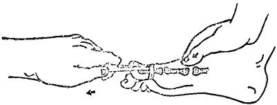 一、跖趾关节脱位:助手固定踝及足跟部,术者用右手拇、食二指捏住拇趾,或用绷带绕住拇趾向背及足尖方向牵引,使足趾过伸,以解脱绞锁在关节间的肌腱和关节囊,另一手食、中指抵住跖骨跖侧,拇指紧抵趾骨近节基部,向远方和跖侧按压,同时跖屈足趾,即可复位(图13~27)。