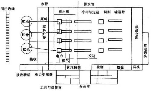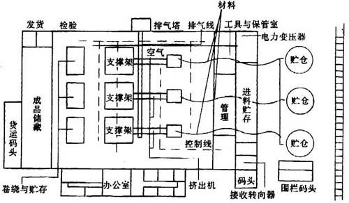 释义 | 车间方案 由于制品及制品生产线的多样性,因此,能满足所有工艺需求的车间方案是不存在的。图20-9和图20-10分别为吹塑薄膜及挤管车间的布局方案,并且还标明了主生产区域与其它辅助工作区域的空间分配形式。为了确定空间需要与建筑物类型,以及有效设置辅助设备及辅助设施,这种车间的设计方案需预先反复比较以选择合适的方案。根据估算的产量来确定码头、仓库、装运及预处理区域的具体位置及大小。设备的放置应确保料流在车间内的畅通,然后再适当地安排产品检验与控制区域。 图20-9 显示局部设备和辅助功能与操作的吹塑薄膜车间规划 图20-10 生产塑料管车间规划图 显示原料处理和贮存系统及货运码头的设备规划和辅助功能的规划 |