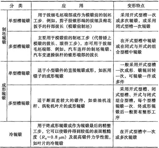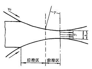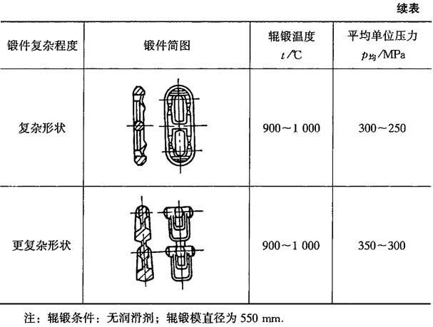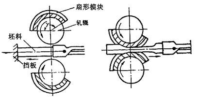 释义 | 辊锻 8.2.1.1 辊锻的实质、特点及分类 1.实质 辊锻是通过装有扇形模块的一对轧辊的旋转运动,借助型槽产生塑性变形,从而获得所需形状尺寸的锻件的轧制—锻造复合工艺.其工作过程示意如图8-13所示.辊锻与一般模锻不同,一般模锻的工作行程是直线运动,而辊锻是旋转运动;与轧制也有差别,轧制的轧辊整个圆周都是工作部分,而辊锻只是扇形模这部分工作. 图8-13 辊锻工作过程 辊锻的实质是毛坯的连续拔长变形过程,毛坯在高度方向压缩后,除一小部分金属横向流动而使毛坯宽度略有增加外,大部分金属沿毛坯长度方向流动,横截面积减校长度增加,因此辊锻适用于长轴类、板片类锻件的生产,而对复杂形状锻件如带阻尼凸台的叶片,辊锻难于生产. 2.特点 辊锻工艺是轧制、模锻两种工艺的结合,集中了这两种工艺的优点.辊锻和一般锻造工艺相比具有如下特点: (1)生产率高.在锤上拔长时,往往需打击多次,而在辊锻上由于锻辊是连续运动的,因此只需辊压几次. (2)锻件质量高.具有良好的金属流线,产品精度高,表面粗糙度值校可实现无余量生产,节约金属材料. (3)模具寿命长.由于辊锻变形是连续静压过程,没有冲击与震动,金属与模具表面之间的相对滑动较少,模具磨损校因而模具寿命长,甚至可以不用模具钢,而采用球墨铸铁或冷硬铸铁制造模具,节约模具钢. (4)设备吨位校金属是逐渐连续变形的,变形区校因此所需设备吨位也小. (5)工艺过程简单,劳动条件好.生产过程易于实现机械化、自动化,设备结构简单,对厂房地基条件要求低. 3.分类 辊锻按型槽的作用分为制坯辊锻和成形辊锻;按型槽的数量分为单型槽辊锻和多型槽辊锻;按型槽的形式分为开式和闭式;按变形温度分为热辊锻和冷辊锻. 辊锻的分类、变形特点及应用详见表8-16. 表8-16 辊锻的分类和应用 8.2.1.2 辊锻的咬入条件及前滑 1.咬入条件 辊锻和轧制一样,实现变形过程的首要条件是能否把毛坯曳入两旋转的轧辊之间,而毛坯的这一曳入过程称为“咬入”.能够实现毛坯曳入的条件即为咬入条件. 毛坯在与旋转轧辊接触时,轧辊对毛坯的作用力如图8-14所示,取其中一个轧辊分析,另一轧辊的作用力情况与之相同. 图8-14 锻辊对毛坯的作用力图解 轧辊对金属的作用力分别为总压力P和摩擦力T.将P、T沿水平方向及垂直方向进行分解,得Px、Pz和Tx、Tz.其中Pz、Tz对毛坯起压缩作用,使之产生塑性变形;而Px阻止毛坯进入轧辊;Tx则力图将毛坯曳入辊中.由此只有当Tx>Px时,毛坯端面才能自由咬入.由图得: Pr=Psinα Tx=Tcosα 则毛坯咬入条件为: Tcosα>Psinα 又 式中 f——摩擦系数; β——摩擦角. 故咬入条件可写成: tanβ≥tanα 即 β≥α 由此可见,只有当咬入角小于或等于摩擦角时,毛坯才能自然咬入.接触摩擦是实现辊锻过程的基本条件,摩擦系数越大越有利于咬入. 钢材纵轧时的摩擦系数f与αmax的数值见表8-17.由于辊锻是在型槽中进行的,且多采用中间咬入的形式,因此辊锻的咬入条件大为改善,一般中间咬入角与端部自然咬入角之间的关系为: 表8-17 钢材纵轧时的f与αmax α中=(1.3~1.5)α端 (8-8) 式中 α中——中间咬入时的咬入角; α端——端部自然咬入时的咬入角. 2.前滑 在辊锻变形区中,金属质点相对于轧辊分别向出口端和入口端滑动,二者之间存在一个分界面,称为中性面,该中性面将变形区分成两部分——前滑区、后滑区,如图8-15所示.在前滑区内模具的切线速度小于毛坯的速度,金属向前滑移,称为前滑.在后滑区内模具的切线速度大于毛坯的速度,金属向后滑移,称为后滑.在实际生产中因为后滑区的毛坯还未最后成形,因此只考虑前滑.金属的前滑使得辊锻后的锻件长度大于模具上相应的型槽长度值.因此,在设计模具时一定要考虑前滑的影响.前滑与辊径、轧件厚度、摩擦系数、轧制温度、轧辊转速、展宽等因素有关,一般用百分数S表示,其经验数据为: 制坯辊锻时,S=4%~6%; 叶片成形辊锻时,预成形道次S=2%~3%,终成形道次S=3%~5%. 8.2.1.3 辊锻力与力矩的计算 1.辊锻力的计算 辊锻时,上下轧辊作用于毛坯上的压力如图8-16所示.在实际计算中常用经验公式或实验数值计算.经验公式为: P=pA (8-9) 式中 P——总压力,N; p——平均单位面积压力,MPa; A——辊锻模在接触弧面上的水平投影面积,mm2. 辊锻模在接触弧面上的水平投影面积A可按下式计算: 图8-15 辊锻变形区金属流动速度分布图 图8-16 变形区中单位压力分布 A=bl 式中 l——变形区长度,mm, R——辊锻模工作半径,mm; △h——压下量,mm; b——变形区平均宽度,mm, 成形辊锻碳钢锻件30钢的平均单位压力见表8-18.当锻件材料为合金时,平均单位压力在参考表8-18的基础上进行修正.制坯辊锻的平均单位压力见表8-19. 表8-18 成形辊锻30钢的平均单位面积压力p均 表8-19 制坯辊锻的平均单位面积压力p均 注:材料:50钢;辊锻模直径为500mm;h0、h1分别为辊锻前、后的毛坯高度,单位为mm 2.辊锻力矩的计算 总压力与辊锻力臂之乘积即为辊锻力矩.其计算公式为(见图8-17): M=2Pa (8-10) 式中 P——总压力; a——力臂,总压力作用点至中心连线的距离. 力臂a可表示为: a=φl 式中 l——变形区长度, φ——合力作用点系数,当辊锻件带毛边时φ=0.25~0.30;当辊锻件不带毛边时φ=0.40~0.45. 图8-17 辊锻力矩 8.2.1.4 制坯辊锻 1.制定辊锻毛坯图 辊锻毛坯图的制定与普通模锻大体相同.根据锻件图,采用“截面图”法得到计算毛坯图,然