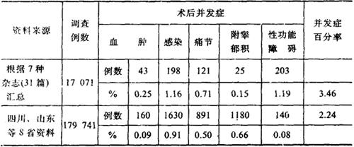 释义 | 输精管绝育术后并发症的防治 输精管绝育术是安全、有效、简便、经济的一种持久性的男性节育法。只要加强责任心,严格执行节育手术常规,并发症是很少的,乃至是可以避免的。术后由于某种原因,个别发生了并发症。只要及时采取有效措施,问题也会得到妥善解决。目前,一般常见并发症包括出血、感染、痛性结节、附睾郁积症和性功能障碍等。各种并发症的组成差异性很大(表.9-4-1)如附睾郁积症为0.15%和0.66%,性功能障碍为1.19%和0.08%。究 其原因,主要是诊断标准不一,调查方法有异。 表9-4-1 有关术后并发症发生率的综合资料 输精管绝育术并发症的处理是一个很复杂的工作,病员来自各方,述说症状各异,思想情况不一,对于那些多处求治而长期未愈者情况更是复杂。若处理不当,可能会“病上加病”,造成工作上的被动,影响计划生育工作开展。在介绍各种并发症防治之前,先就并发症的处理原则作如下说明。 (1)到医院就诊的病人,往往有各种各样的具体情况,有一些人并不是单纯为了医治疾病而来的。因此,对待这些病人,我们应严肃认真,耐心听取主诉和要求,仔细作好有关体检,以取得他们的信任,争取他们的合作。有些病人,谈话往往离题太远,譬如讲述他与其爱人、家庭成员、周围群众及组织上的关系,或谈到自己的工作或家庭经济情况,以及讲述很多与绝育手术毫不相关的症状,等等。实际上这些常常是弄清和解决问题的关键所在。虽然经过多方面调查了解及有关检查,并经过认真分析,得出了实事求是的结论,但在未做好个人、家庭及所在单位的工作之前,不要轻易直接向病人作出与绝育术有关或无关的结论,尤其是对那些经久不愈的病人,更应慎重。 (2)对确属绝育术后器质性并发症,应及时治疗,有关费用应按规定主动解决。但对那些在治疗上或经济上提出过高要求的病人,应做好解释工作,同时也应解决些实际困难问题。 (3)对于主诉与客观情况不符,或提出某些不科学的看法者,应耐心作好解释,使他们懂得科学道理,解除顾虑,增加信心。 (4)若发现患有与绝育手术无关的疾病,如腰骶部骨骼、肌肉或神经等病变,亦应积极关心处理,求得早日痊愈。但应向病员及组织说明,该病与绝育手术无关。 (5)并发症的治疗,原则上就地处理。对确因某种原因需要上级医院会诊鉴定者,应预先与有关单位联系,由当地了解情况的医务人员护送前往。上级医院的会诊结论应明确,便于基层医院及有关部门根据结论处理。基层医疗单位或行政组织,切不可让病人自行外出就医。这样到处自找医生,有时不但不能治愈疾病;反而给病人增加思想负担,造成更大痛苦。为了加强并发症的管理,统一并发症诊治标准,各级医院设专人负责这一工作是很有必要的。 一、出血 由于适应症的选择或手术操作不当,都可以引起术后局部出血。出血一般发生在术后24小时内。外出血早期易被发现,亦便于处理。内出血有时则否,尤其是出血缓慢者就更难及时发现。根据出血部位不同,可分为阴囊皮不淤血,精索血肿及阴囊 血肿。 (一)诊断 1.阴囊皮下淤血 血液积于阴囊皮下,皮肤在早期呈紫红色,晚期为青紫色,它往往像外出血,易被受术者自己早期发现而就医。 2.精索血肿 往往因输精管残端及其周围组织较细小的血管被损伤,血液积于精索鞘膜之内,形成梭形肿块,其边界一般较清楚,表面光滑,张力较高,可随精索活动,压痛不很严重,数天后,有部分病例可见阴囊皮肤青紫。诊断时,有两种情况应注意。 (1)阴囊紧缩。术时结扎位置过高,术后因寒冷等原因使阴囊更加收缩,血肿之一部分可隐藏于腹股沟皮下环之上,致使在阴囊内不易被扪及,往往当皮下环周围出现青紫时才被发现。因此,当受术者早期感觉局部胀痛,而阴囊内未扪到结扎结节时,就应将精索向下牵引进行检查。 (2)精索血肿有时易和精索炎相混淆。一般情况下,后者出现的时间较晚,并以进行性加重的疼痛为主要症状,肿块边界不清,常常与阴囊壁粘连,压痛明显,炎症重者,可出现寒热等全身症状。 3.阴囊血肿 往往是较大的血管断裂引起。最常见的是输精管动脉断裂。这种出血多数来势很猛,在术后留察的2小时中,足以被医务人员检查发现:可扪及肿块,出血过多时,外观亦可见阴囊肿大。早期未得到及时处理,阴囊可逐渐肿大及皮肤青紫,并可出现阴茎、会阴及腹股沟区肿胀青紫,甚至可出现失血性全身症状。 (二)治疗 1.阴囊皮下淤血 若有活动性出血,可做局部压迫止血,无效的作全层缝合。出血已停止,只有皮下淤血者,一般不需特殊处理。对浸润范围大,淤血多的病例,给予局部热敷和抗菌药物。 2.精索血肿 术后早期,可用四头带加压包扎,局部冷敷,严密观察其变化。若局部继续肿胀,则应切开止血和消除积血,并用抗菌药物预防感染,若出血已停止,术后72小时可穿刺抽出积液,向血肿内注入透明质酸酶,1500单位,以加速积血的吸收。局部热敷或用特定电磁波治疗机(即TDP)作局部照射,距离约20cm。可根据局部适宜的热度,再加调整。每日2次,.每次半小时,7~10天为一疗程,并用抗菌药物预防感染。 3.阴囊血肿 凡遇到发展快速的阴囊内出血,都应及时切开止血和消除积血。对于来院已晚,出血虽已停止,若血肿较大,还是以手术消除积血为宜,以免积血长期不能完全吸收,招致继发感染,或局部出现较大的纤维性硬快。对出血已停止的较小的阴
