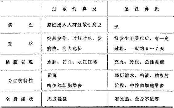 | 释义 | 过敏性鼻炎 【病因】 本病为鼻粘膜对某种物质所发生的过敏反应(也称变态反应),常与过敏性鼻窦炎同时发病。 一、过敏性体质:患儿常有哮喘等麻疹病史。 二、接触过敏原:包括吸入物(尘埃、花粉、霉菌、动物毛发与皮屑等)、食物(鱼、虾、牛奶)、药物等。 【临床表现】 症状特点是发病快,消失也快。犯病开始先是鼻腔痒痒,继而喷嚏、鼻塞、流大量清水样鼻涕,并伴有嗅觉减退、头昏等。全身无症状或仅有轻微症状。 鼻粘膜水肿,呈苍白或淡紫色,鼻道内见稀薄分泌物。 【诊断】 典型病例易诊断,临床上易误将过敏发作认为伤风、感冒。 过敏性鼻炎与急性鼻炎鉴别表