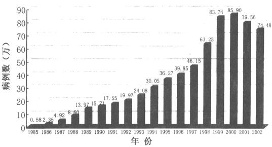 2001年全国报告性病病例795612例,较2000年下降了7.38%,为开展性病报告工作以来出现的首次下降。其中淋病、尖锐湿疣和梅毒均出现下降,其下降幅度分别为17.89%、12.31%和3.66%,但非淋菌尿道(宫颈)炎(NGU)和生殖器疱疹仍出现增长,增长幅度分别为5.02%和14.05%,并且全国NGU的报告病例数首次超过淋病,居8种报告性病的第一位,反映出我国性病的流行谱在发生变化。2002年,全国报告的性病病例数继续下降,共报告性病744848例,较2001年下降6.17%(不包括HIV/AIDS),其中淋病、尖锐湿疣和梅毒再次出现下降,分别下降了11.87%、13.60%和3.78%;而NGU和生殖器疱疹仍出现小幅增长,分别为3.04%和1.15%,全国NGU的报告数继续超过淋病,居8种性病的首位,这表明今后要重视对该病的防治工作。