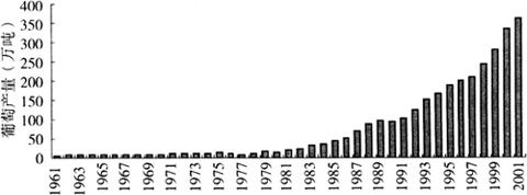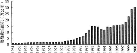 释义 | 近年来我国的葡萄栽培面积和产量 根据世界粮农组织(FAO)的统计资料,1999年世界葡萄的年产量为6069万吨,占水果总产量的13.6%,仅次于柑橘,位居世界水果产量第二位。中国的水果产量已位居世界第一位。2001年,中国的葡萄产量已位居各种水果第五位。从图1和图2可以看出,我国20年来的葡萄面积和产量一直处于发展趋势(FAO统计资料)。 图1 1961年以来我国葡萄栽培面积的年变化 图2 1961年以来我国葡萄产量的年变化 |