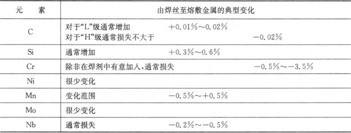 埋弧焊焊缝中元素的增减取决于采用的焊剂。某些焊剂有意增加合金元素如铌和钼,另一些可能会烧损容易氧化的元素如铬。有些焊剂是不太活泼的,它们含有少量合金元素来弥补其烧损,这样可以形成与焊丝十分相近的焊缝熔敷金属。表3.5-8列出埋弧焊时合金元素的变化。