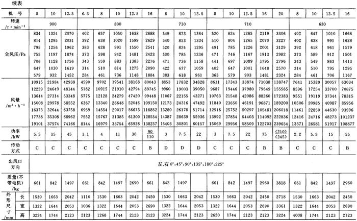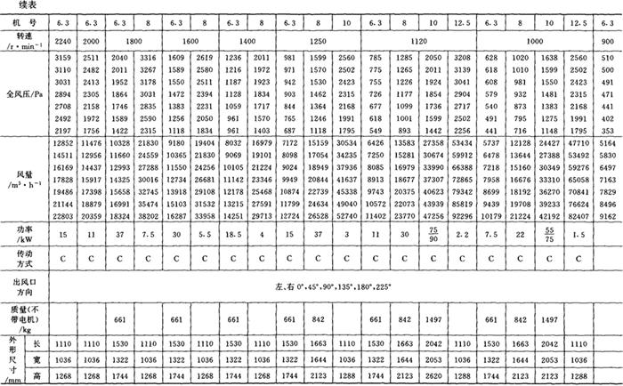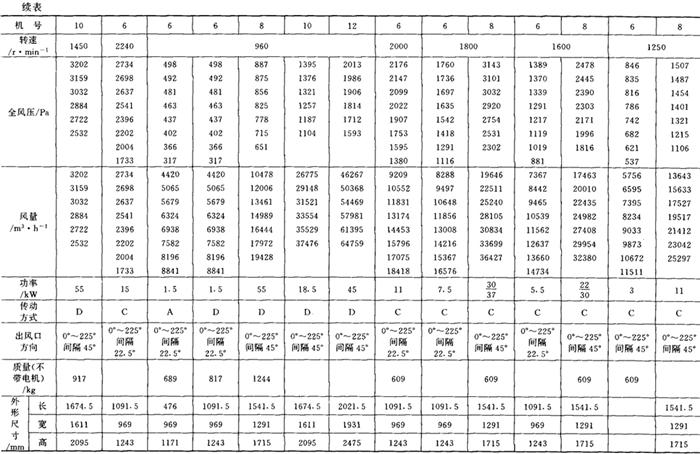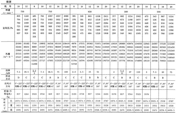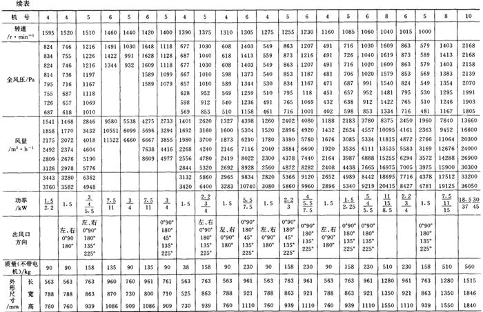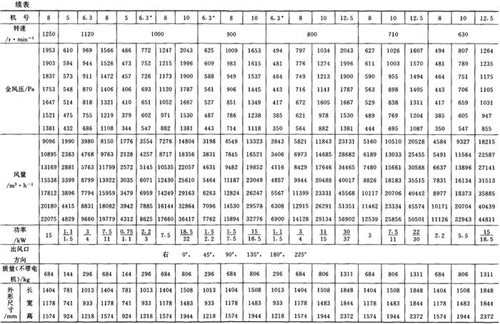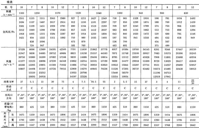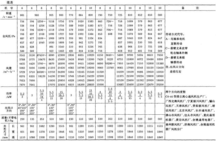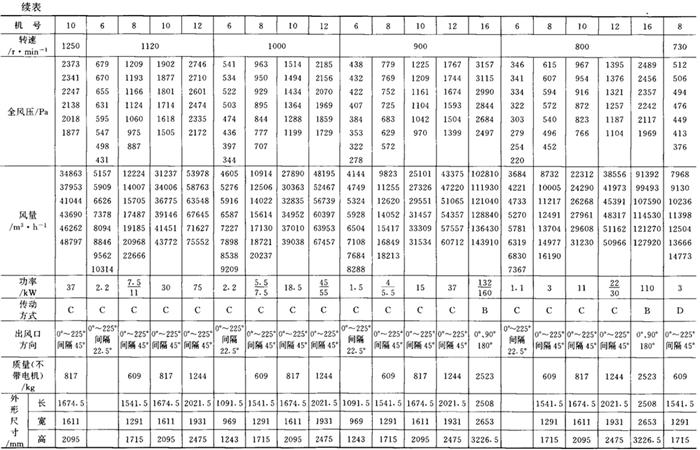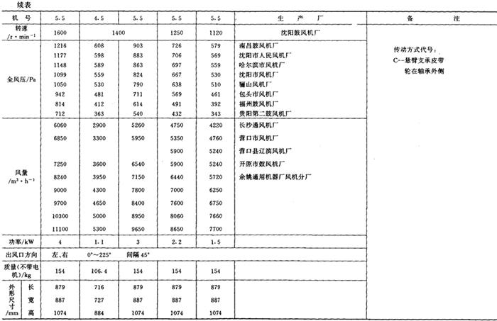 释义 | 通风机 (一)离心通风机型号 1.用途及代号(表9-9-77) 表9-9-77 离心通风机用途及代号 图9-9-54 混合段 2.型号意义 型号由型式和品种两部分组成: 型式举例:□□-□□-□ □-通风机用途代号:□-通风机压力系数,□□-通风机 比转数;□通风机设计顺序号。 品种举例:No.□-通风机机号(叶轮外径的dm数)。 传动方式代号意义见表9-9-79: 表9-9-79 离心通风型代号的意义 3.叶轮旋转方向代号 右-从原动机一端正视叶轮旋转为顺时针。 左-从原动机一端正视叶轮旋转为逆时针。 4.风口位置 基本出风口位置有右或左0°、45°、90°、135°、180°、225°、270°,补充出风口位置有15°、30°、60°、75°、105°、120°、150°、165°、195°、210°。 (二)中低压离心式通风机 1.4-72、B4-72型离心式通风机 见表9-9-80。 表9-9-804-72、B4-72型离心通风机 2.T4-72型离心通风机 见表9-9-81。 表9-9-81T4-72型离心通风机 3.4-68型离心通风机 见表9-9-82。 表9-9-824-68型离心通风机 注:传动方式代号: A-无轴承电机直联传动;B-悬臂支承皮带轮在轴承中间;C-悬臂支承皮带轮在轴承外侧;D-悬臂支承联轴器传动。 4-68型离心通风机的生产厂:武汉鼓风机厂、南昌鼓风机厂、沈阳鼓风机厂、宁夏银川风机厂、南通鼓风机厂、贵阳鼓风机厂、营口市风机厂、重庆通用机器厂、湖北省风机厂、原平鼓机厂、重庆江北风机厂、文登风机厂、安徽省风机厂、甘肃靖远通风机厂、佳木斯通用机械厂、石家庄市风机厂、贵阳第二鼓风机厂、包头市风机厂、个旧风机厂、南京通风机厂、济南第二风机厂、江北风机厂、营口离心机厂、余姚通用机器厂风机分厂。 (三)高压离心通风机 1.9-19型离心通风机 见表9-9-83。 表9-9-839-19型离心通风机 注:传动方式代号: A无轴承电机直联传动;D-悬臂支承联轴器传动。 9-19型离心通风机的生产厂:沈阳鼓风机厂、南昌鼓风机厂、湘江风机厂、沈阳人民风机厂、广西北海风机厂、大连市风机厂、余姚通用机械厂、哈尔滨市风机厂、枣庄市通用机械厂、南通鼓风机厂、重庆江北风机厂、天津风机厂、肇东风机厂、宁波风机厂、济南风机厂、武汉市通风机厂、广东佛山风机厂、包头市风机厂、营口市风机厂、重庆通用机器厂、上海长风鼓风机厂、湖北省风机厂、原平县鼓风机厂、武汉鼓风机厂、余姚通用机器厂风机分厂、银川市风机厂、吉林市鼓风机厂、四平市风机厂、陕西骊山风机厂、西安朝阳风机厂、天津鼓风机厂、宁夏银川风机厂、新疆七一风机厂、呼和浩特风机厂、上海鼓风机厂、上海彭江机械厂、福州鼓风机厂、贵阳鼓风机厂、安徽省风机厂、甘肃靖远通风机厂、北京风机厂、佳木斯通用机械厂、石家庄市风机厂、贵阳第二鼓风机厂、青岛风机厂、成都风机厂、广州风机厂、西安风机厂等。 2.9-26型离心通风机 见表9-9-84。 表9-9-849-26型离心通风机 注:传动方式代号: A-无轴承电机直联传动;D-悬臂支承联轴器传动。 9-26型离心通风机的生产厂:沈阳鼓风机厂、湘江风机厂、南昌鼓风机厂、沈阳人民风机厂、广西北海风机厂、宁夏银川风机厂、余姚通用机器厂、哈尔滨市风机厂、枣庄市通用机械厂、南通鼓风机厂、重庆江北风机厂、天津市通风机厂、福州鼓风机厂、甘肃靖远通风机厂、北京风机厂、佳木斯通用机械厂、石家庄市风机厂、贵阳第二鼓风机厂、肇东风机厂、宁波风机厂、济南风机厂、武汉市通风机械厂、广东佛山市风机厂、包头市风机厂、营口市风机厂、重庆通用机器厂、上海长风鼓风机厂、湖北省风机厂、原平县鼓风机厂、武汉鼓风机厂、贵阳鼓风机厂、沈阳鼓风机厂一分厂、沈阳风机厂、吉林市鼓风机厂、上海鼓风机厂、湘江风机厂、青岛风机厂、成都风机厂、西安风机厂等。 3.10-19型离心通风机 见表9-9-85。 表9-9-8510-19型离心通风机 (四)排尘离心通风机 1.C6-46型排尘离心通风机 见表9-9-86。 表9-9-86C6-46型排尘离心通风机 2.C4-73-11型排尘离心通风机 见表9-9-87。 表9-9-87C4-73-11型排尘离心通风机 3.C6-48型排尘离心通风机 见表9-9-88。 表9-9-88C6-48型排尘离心通风机 C6-48型排尘离心通风机生产厂:营口市风机厂、西安风机厂、余姚通用机器厂风机分厂、济南风机厂、济南市第二风机厂、山东省文登风机厂、青岛风机厂、南昌市鼓风机厂、武汉市消声器厂、河南省周口风机厂、佛山市风机厂、北海市风机厂、大理通用机械厂、新疆七一风机厂、梧州市风机厂、营口离心机厂、山东省临沂市风机厂、开原市鼓风机厂、沈阳鼓风机厂、湘江风机厂、沈阳市人民风机厂、广西北海风机厂、宁夏银川风机厂、余姚通用机器厂、哈尔滨市风机厂、新乡市通用机械厂、枣庄市通用机械厂、重庆江北风机厂、福州鼓风机厂、贵阳鼓风机厂、安徽省风机厂、甘肃靖远通风机厂、北京风机厂、佳木斯通用机械厂、石家庄市风机厂、贵阳第二鼓风机厂、肇东风机厂、包头市风机厂、营口市风机厂、重庆通用机器厂、原平县鼓风机厂、武汉鼓风机厂、南通鼓风机厂、天津风机厂、吉林鼓风机厂。 |