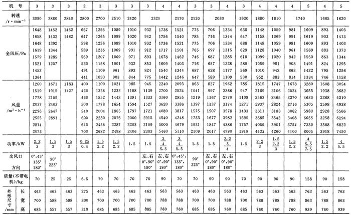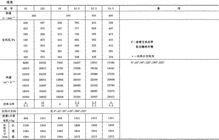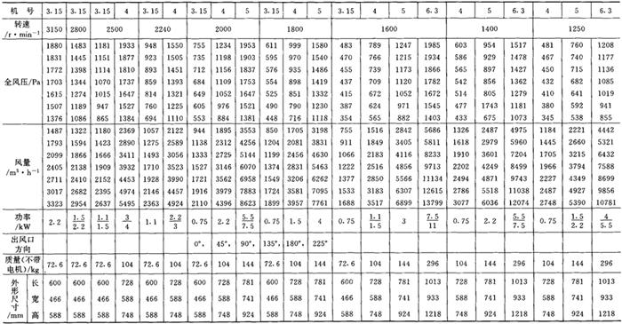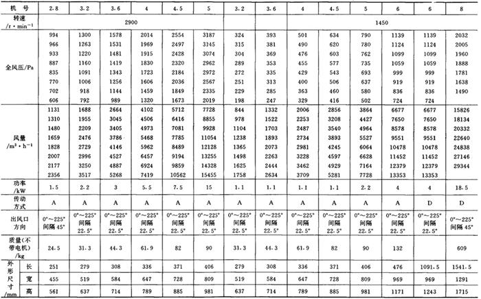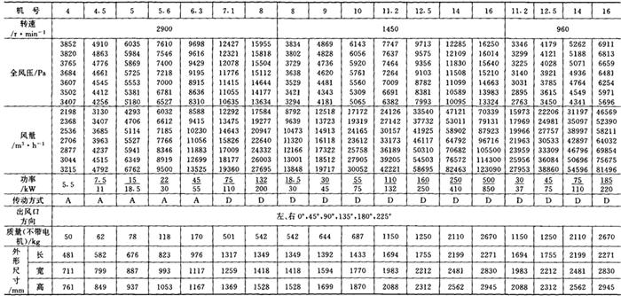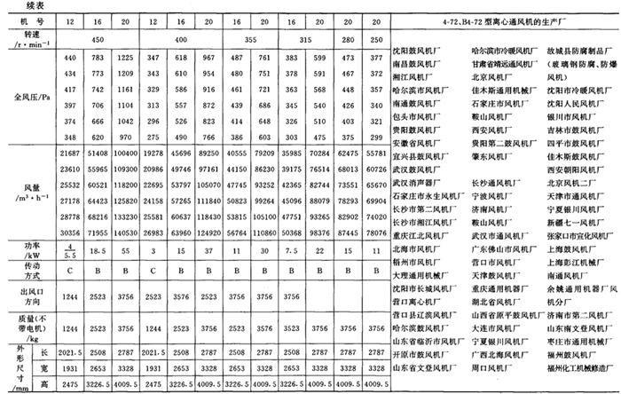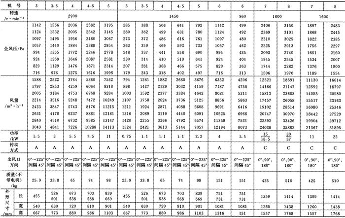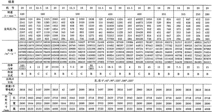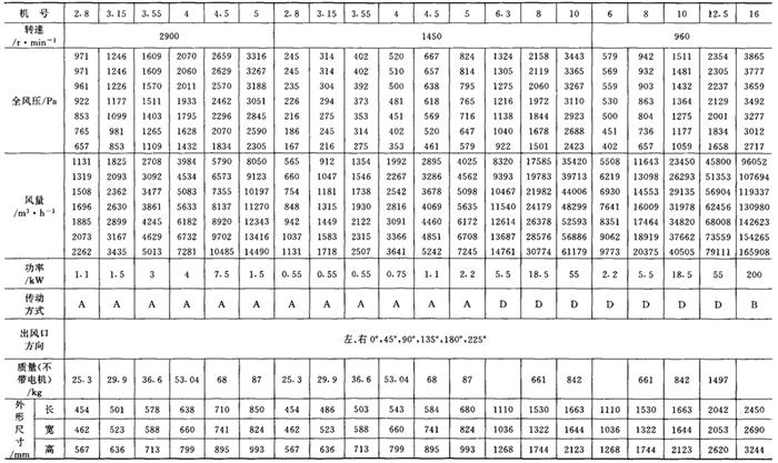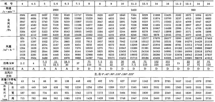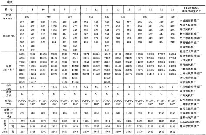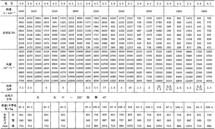 释义 | 通风机 (一)离心通风机型号 1.用途及代号(表9-9-77) 表9-9-77 离心通风机用途及代号 图9-9-54 混合段 2.型号意义 型号由型式和品种两部分组成: 型式举例:□□-□□-□ □-通风机用途代号:□-通风机压力系数,□□-通风机 比转数;□通风机设计顺序号。 品种举例:No.□-通风机机号(叶轮外径的dm数)。 传动方式代号意义见表9-9-79: 表9-9-79 离心通风型代号的意义 3.叶轮旋转方向代号 右-从原动机一端正视叶轮旋转为顺时针。 左-从原动机一端正视叶轮旋转为逆时针。 4.风口位置 基本出风口位置有右或左0°、45°、90°、135°、180°、225°、270°,补充出风口位置有15°、30°、60°、75°、105°、120°、150°、165°、195°、210°。 (二)中低压离心式通风机 1.4-72、B4-72型离心式通风机 见表9-9-80。 表9-9-804-72、B4-72型离心通风机 2.T4-72型离心通风机 见表9-9-81。 表9-9-81T4-72型离心通风机 3.4-68型离心通风机 见表9-9-82。 表9-9-824-68型离心通风机 注:传动方式代号: A-无轴承电机直联传动;B-悬臂支承皮带轮在轴承中间;C-悬臂支承皮带轮在轴承外侧;D-悬臂支承联轴器传动。 4-68型离心通风机的生产厂:武汉鼓风机厂、南昌鼓风机厂、沈阳鼓风机厂、宁夏银川风机厂、南通鼓风机厂、贵阳鼓风机厂、营口市风机厂、重庆通用机器厂、湖北省风机厂、原平鼓机厂、重庆江北风机厂、文登风机厂、安徽省风机厂、甘肃靖远通风机厂、佳木斯通用机械厂、石家庄市风机厂、贵阳第二鼓风机厂、包头市风机厂、个旧风机厂、南京通风机厂、济南第二风机厂、江北风机厂、营口离心机厂、余姚通用机器厂风机分厂。 (三)高压离心通风机 1.9-19型离心通风机 见表9-9-83。 表9-9-839-19型离心通风机 注:传动方式代号: A无轴承电机直联传动;D-悬臂支承联轴器传动。 9-19型离心通风机的生产厂:沈阳鼓风机厂、南昌鼓风机厂、湘江风机厂、沈阳人民风机厂、广西北海风机厂、大连市风机厂、余姚通用机械厂、哈尔滨市风机厂、枣庄市通用机械厂、南通鼓风机厂、重庆江北风机厂、天津风机厂、肇东风机厂、宁波风机厂、济南风机厂、武汉市通风机厂、广东佛山风机厂、包头市风机厂、营口市风机厂、重庆通用机器厂、上海长风鼓风机厂、湖北省风机厂、原平县鼓风机厂、武汉鼓风机厂、余姚通用机器厂风机分厂、银川市风机厂、吉林市鼓风机厂、四平市风机厂、陕西骊山风机厂、西安朝阳风机厂、天津鼓风机厂、宁夏银川风机厂、新疆七一风机厂、呼和浩特风机厂、上海鼓风机厂、上海彭江机械厂、福州鼓风机厂、贵阳鼓风机厂、安徽省风机厂、甘肃靖远通风机厂、北京风机厂、佳木斯通用机械厂、石家庄市风机厂、贵阳第二鼓风机厂、青岛风机厂、成都风机厂、广州风机厂、西安风机厂等。 2.9-26型离心通风机 见表9-9-84。 表9-9-849-26型离心通风机 注:传动方式代号: A-无轴承电机直联传动;D-悬臂支承联轴器传动。 9-26型离心通风机的生产厂:沈阳鼓风机厂、湘江风机厂、南昌鼓风机厂、沈阳人民风机厂、广西北海风机厂、宁夏银川风机厂、余姚通用机器厂、哈尔滨市风机厂、枣庄市通用机械厂、南通鼓风机厂、重庆江北风机厂、天津市通风机厂、福州鼓风机厂、甘肃靖远通风机厂、北京风机厂、佳木斯通用机械厂、石家庄市风机厂、贵阳第二鼓风机厂、肇东风机厂、宁波风机厂、济南风机厂、武汉市通风机械厂、广东佛山市风机厂、包头市风机厂、营口市风机厂、重庆通用机器厂、上海长风鼓风机厂、湖北省风机厂、原平县鼓风机厂、武汉鼓风机厂、贵阳鼓风机厂、沈阳鼓风机厂一分厂、沈阳风机厂、吉林市鼓风机厂、上海鼓风机厂、湘江风机厂、青岛风机厂、成都风机厂、西安风机厂等。 3.10-19型离心通风机 见表9-9-85。 表9-9-8510-19型离心通风机 (四)排尘离心通风机 1.C6-46型排尘离心通风机 见表9-9-86。 表9-9-86C6-46型排尘离心通风机 2.C4-73-11型排尘离心通风机 见表9-9-87。 表9-9-87C4-73-11型排尘离心通风机 3.C6-48型排尘离心通风机 见表9-9-88。 表9-9-88C6-48型排尘离心通风机 C6-48型排尘离心通风机生产厂:营口市风机厂、西安风机厂、余姚通用机器厂风机分厂、济南风机厂、济南市第二风机厂、山东省文登风机厂、青岛风机厂、南昌市鼓风机厂、武汉市消声器厂、河南省周口风机厂、佛山市风机厂、北海市风机厂、大理通用机械厂、新疆七一风机厂、梧州市风机厂、营口离心机厂、山东省临沂市风机厂、开原市鼓风机厂、沈阳鼓风机厂、湘江风机厂、沈阳市人民风机厂、广西北海风机厂、宁夏银川风机厂、余姚通用机器厂、哈尔滨市风机厂、新乡市通用机械厂、枣庄市通用机械厂、重庆江北风机厂、福州鼓风机厂、贵阳鼓风机厂、安徽省风机厂、甘肃靖远通风机厂、北京风机厂、佳木斯通用机械厂、石家庄市风机厂、贵阳第二鼓风机厂、肇东风机厂、包头市风机厂、营口市风机厂、重庆通用机器厂、原平县鼓风机厂、武汉鼓风机厂、南通鼓风机厂、天津风机厂、吉林鼓风机厂。 |