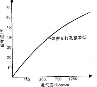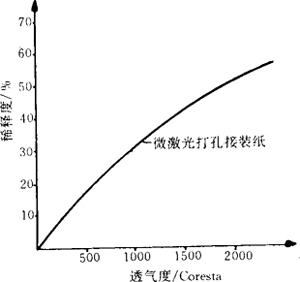 释义 | 通风预打孔接装纸 (一)接装纸的预打孔方式 接装纸预打孔的方法主要采用激光打孔。见图5-3-1所示。 激光打孔的优点: 图5-3-1 激光打孔示意图 (1)可精确控制孔的大小,透气率均匀。 (2)透气率的大小范围广泛。 (3)可选择不可见的显微穿孔或可见的宏观穿孔。 (二)打孔接装纸与稀释度的关系 打孔接装纸与稀释度的关系见图5-3-2,5-3-3所示。 图5-3-2 宏激光打孔接装纸透气度与稀释度的关系 图5-3-3 微激光打孔接装纸与稀释度的关系 |