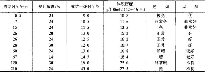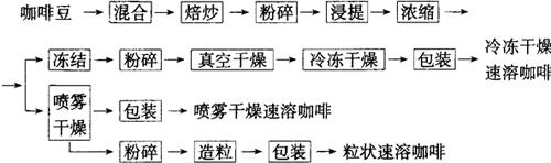 释义 | 速溶咖啡 速溶咖啡与普通咖啡一样,从咖啡豆提取有效成分并干燥而成的。1909年,速溶咖啡首先在美国商品化。20世纪50年代用喷雾干燥法生产的空心颗粒状速溶咖啡取代了真空滚筒干燥法生产的粉末状咖啡。60年代又开发了冷冻干燥速溶咖啡。冻干产品热变性小,感官质量高,并有焙炒磨浆咖啡的大颗粒状,但成本较高。目前冻干法和喷干法两种速溶咖啡商品均有,可根据不同需要进行生产。速溶咖啡中的咖啡因含量大于3%,水分含量小于4%。 (一)速溶咖啡生产工艺流程 速溶咖啡的生产从咖啡豆的选择到原料配合比例、干燥温度和芳香保持,各国均有独自制造技术。由咖啡豆生产速溶咖啡的生产工艺流程如下: (二)生产要点 1.配料 咖啡原料从焙炒至浸提工序与牛奶咖啡饮料的生产工艺相同。混合或配料是将不同品种和质量的咖啡豆按一定配比进行混合,以在焙炒时获得较佳香味,同时稳定产品质量和降低成本。 2.焙炒 生咖啡豆颜色为发暗的绿色或黄色,在热风下焙炒变为茶褐色。咖啡特有芳香和风味是咖啡豆焙炒形成的,焙炒条件的设定很重要,一般焙炒温度180~250℃,时间15min左右,根据咖啡豆种类决定。重度焙炒比轻炒时间要长1~2min。 3.浸提 焙炒咖啡豆用专用辊式粉碎机粉碎,在浸提器中用高温、高压的热水浸提。咖啡豆浸提时粉碎的粒度大小、加水量、浸提时间与方法决定浸提物的固形物含量。采用逆流浸提时,咖啡与水的比例因不同咖啡品种和所要求的浸提率而有差异,但咖啡浸提时的加水量不要太多。实践表明,用咖啡豆10倍量的水浸提时,浸提出的固形物量仅比1倍量的水增加10%。而且加水量多,浓缩和干燥过程所需的能量增加,成本增高,是不经济的。因此浸提时的料水比一般为1∶(3.5~5.0),浸提时间60~90min,浸提温度90℃以上。 生产速溶咖啡时的咖啡浸提需要在压力和高温下进行,咖啡浸提液浓度一般30%~32%(普通浸提时浓度仅有10%~12%)。 当咖啡浸提液浓度达到30%时,可直接进行干燥,否则要预先浓缩,达到规定浓度后再行干燥。 4.浓缩 当咖啡浸提液浓度低时,需要浓缩至25%~30%,可采用加热真空浓缩,为了抑制咖啡香气的变质和散逸,有时也采用冻结浓缩。 5.干燥 (1)喷雾干燥 固形物浓度30%左右的咖啡浓缩液在200~300℃热风温度下经喷雾干燥成为100~150μm的空心颗粒,产品水分2%~3%,喷雾干燥不能避免香气的散失,但设备简单,成本低。 喷雾干燥前,浓缩液首先在5~10℃温度下用离心分离机去除不溶性碳水化合物,防止干燥时成为焦油污染干燥器,雾化喷头的压力2.0~3.5MPa,每个喷嘴流量100~250kg/h,为了提高热效率并获得一定粒径,应使用多喷嘴式喷头。为防止过热,在喷雾塔底部将物料冷却至35℃左右。喷雾干燥速溶咖啡时应注意以下影响其质量的几个指标。 ①产品含水量:为2%~3%,含水量4%以上的产品在保藏时易散失香气。产品含水量与干燥机的热风量、进口热风温度、雾化度和浓缩液的进料温度有关。 ②产品密度:产品密度变化与干燥机进风温度和浓缩液中溶解的气体量成反比,与雾化度和浓缩液进料温度成正比,并与浓缩液的浓度有关,浓度低,微粒多,粗粒少,壁薄。当浓度超过32%时,产品密度急剧上升,空心粒子变为粗粒,壁变厚。 ③色泽:产品色泽应为暗褐色,与焙炒时咖啡豆的色泽有关。喷雾干燥时空心颗粒较少,厚壁粒子呈暗褐色,浓缩液浓度高时也呈暗褐色。 ④香气保持:与色泽一样,厚壁粗粒多、浓缩液浓度高、香气成分散逸少。同时干燥时热风温度低,干燥度高,其塔底产品冷却充分,香气保持结果好。 (2)冷冻干燥 咖啡浓缩液冷冻结冰后,将其粉碎、筛分,进行真空冷冻干燥。产品多为1.0~1.7mm的多孔性粒子。冷冻干燥在低温下进行,浓缩液的香气成分能很好保持,可是由于粉碎、筛分等在低温下进行,干燥时间长、能耗高、设备费用高、成本高。 冷冻干燥影响产品质量的生产条件如下: ①浸提、浓缩决定的成分、浓缩度。 ②冻结时气泡混入率。 ③冻结速度决定的冰晶直径。 ④粉碎、筛分决定的冻结颗粒直径。 ⑤干燥时的真空度、加热量、颗粒直径及其堆积厚度等决定的升华面温度。 ⑥干燥时的热板温度和干燥时间。 以上影响最大的是浓缩液的冻结方法。冻结方法与条件参见表2-6-10。当咖啡浸提浓缩液固形物浓度为28%,冻结颗粒直径1.2~2.7mm,干燥时堆积厚度为15mm,加热时颗粒表面温度40℃以下,产品含水量2.5%时,冻结条件对产品特性的影响如下: 表2-6-10 冻结方法与条件 ①产品色调:冻结条件与干燥时真空度影响产品色泽,缓慢冻结产品反射率比速冻产品低,为此可以采用缓慢冻结或开始缓慢冻结,随后速冻的两步冻结法或控制冻结和干燥条件,使其形态发生变化。冻结条件、干燥时间对速溶咖啡质量的影响见表2-6-11。 由表可见,冻结速度越慢,产品色调接近黑褐色,冻结速度快,干燥速度也快。真空度对产品色调的影响较小,速冻品在26.7Pa真空下为白色,106.7Pa时近于缓慢冻结结晶。 表2-6-11 咖啡冻结条件、干燥时间与质量的关系 ②产品体积密度:冻结条件和真空度对体积密度的影响,超缓慢冻结时密度最大。缓慢冻结表面形成包膜,水蒸气透过速度慢,干燥速度因而变慢,冻结速度快,密度变小,风味也好。发泡产品密度最小。 真空度从33.3Pa提高至106.7Pa时,总体上密度略有增加。 ③产品颗粒强度:颗粒强度可用体积减少率表示,是用振幅4cm,频率21