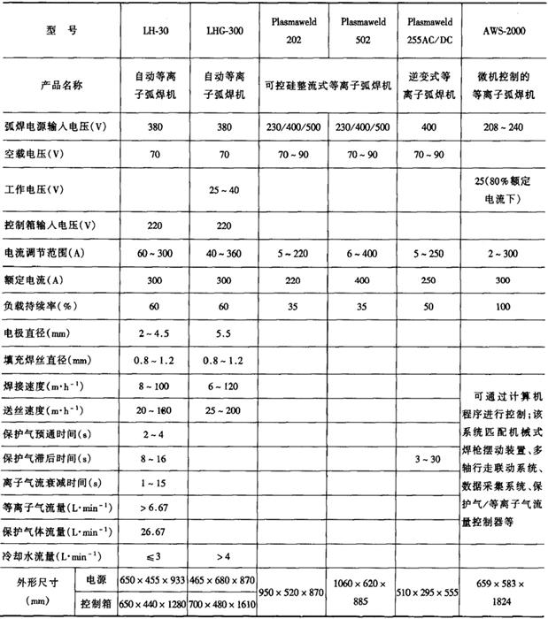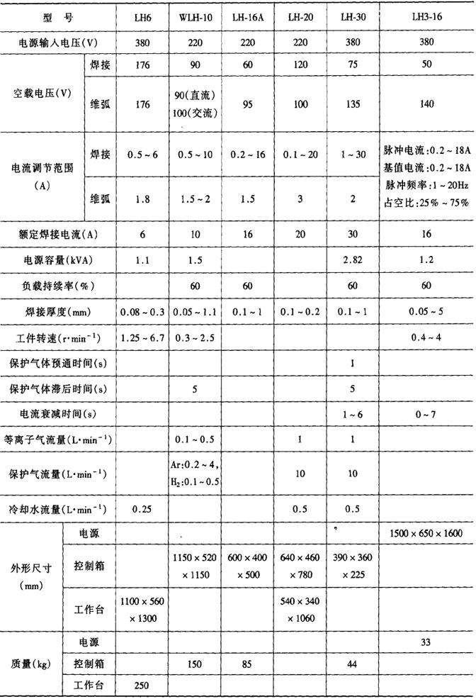 表1-7-4为几种强流等离子弧焊机的技术参数。典型的国产微束等离子弧焊机的技术参数如表1-7-5所示。
