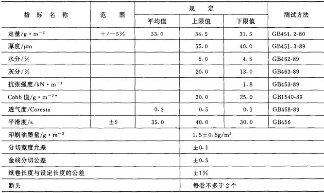 释义 | 部分接装纸产品 (一)龙游满德水松纸有限公司 龙游满德水松纸有限公司企业标准见表5-3-2。 表5-3-2 龙游满德水松纸有限公司企业标准 注:*用可勃(Cobb)吸收仪测定纸或纸板的表面吸水能力。 (二)上海青浦红星纸厂 上海青浦红星纸厂接装纸企业标准见表5-3-3。 表5-3-3 上海青浦红星纸厂接装纸企业标准 (三)四川省青城造纸厂 四川省青城造纸厂接装纸测试数据见表5-3-4 表5-3-4 四川省青城造纸厂接装纸测试数据 注:执行行业标准 (四)安徽造纸厂 安徽造纸厂企见标准见表5-3-5。 表5-3-5 安徽造纸厂接装纸企业标准 |