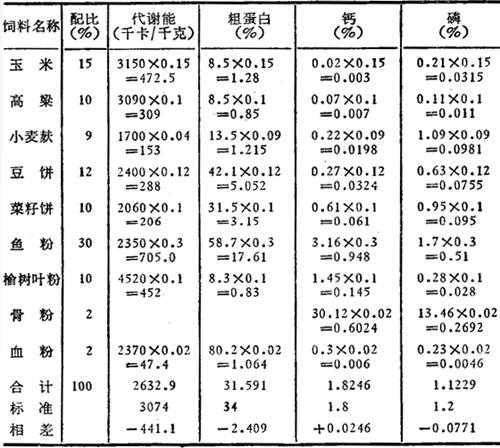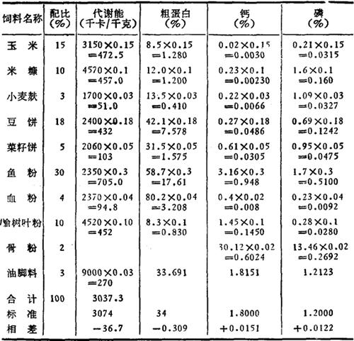 试差法就是先将各种原料试定一个大概比例(主要根据以往饲喂经验和参考其它有关配方),然后计算各营养指标和标准对照,若某营养指标不足或多余时,应再调正饲料比例,通过反复计算,直至所有的营养指标都满足或接近饲养标准为止。此法简单易学,但计算繁琐,尤其是初学者,往往要花费较多时间才能调平,此种方法在生产中经常应用。
