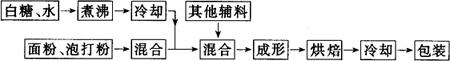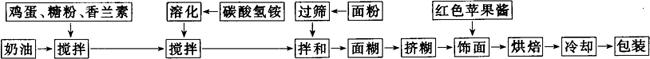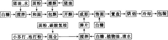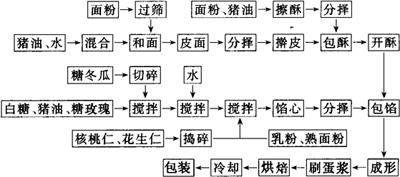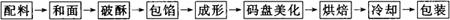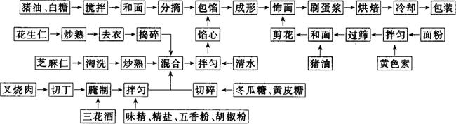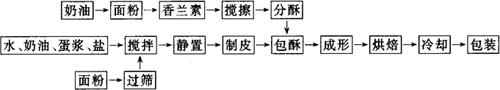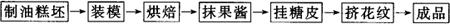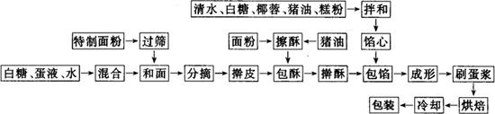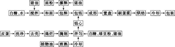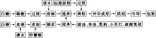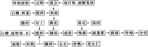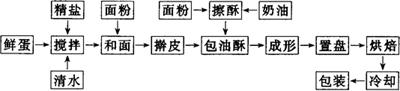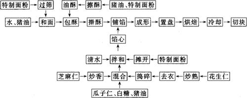 释义 | 酥类糕点 酥类糕点历史较为悠久,各地都有自己的特色产品。其配料多重糖、重油。制作工艺简单,便于机械化生产,产量高,是糕点生产中的大宗品种之一。 酥类糕点主要是将面、糖、油及少量水和碳酸氢铵一次调制后再经成形、烘焙而制成的。产品特点是:含糖含油量较大,可加入各种果仁,产品色泽金黄,并有自然开裂的花纹。品质极酥松,入口不用大嚼,易碎。口味香甜、口感油润。多数产品不包馅心,物美价廉,深受消费者的欢迎。 (一)白油桃酥 1.原料配方(kg) 富强粉24,白糖11.5,鸡蛋2.25,猪油12,桂花1.25,核桃仁2.5,碳酸氢铵、水适量。 2.工艺流程 3.制作方法 配料与和面 先将白糖、鸡蛋、碳酸氢铵、水放入和面机中搅拌,再放入猪油、桂花、核桃仁继续搅拌均匀,最后加入富强粉和制。和制时间不宜过长,防止面团上劲。 分剂 将和好的面团分块,分别切成长方形条,再将其搓成长圆条,切成定量的面剂,然后扑上干面。 磕模 将面剂放入模内,按沿削平,然后磕出。生坯要求模纹清晰,成形规整。 码盘 将磕出的生坯按一定距离码入烤盘内,防止烘焙时成品互相粘连。 烘焙 将盛有生坯的烤盘送入烘焙温度为130~140℃的烤炉内,约烤10min,出炉温度为280~290℃。 冷却和包装 出炉后的装有产品的烤盘要交错码放,以利于冷却。待温度降至室温,即可包装、装箱、入库。 4.质量要求 规格形状:扁圆形,块形端正,大小厚薄一致,成品面积和表面的自然裂纹均匀,面积为生坯面积的1.3~1.5倍。 色泽:深麦黄色,色泽一致,不焦煳。 组织状态:具有均匀的小蜂窝,不生心,不欠火,不含杂质。 口味口感:酥松适口,无异味,具有核桃、桂花的香味。 将上述配方中的猪油改为花生油,制得的产品即为素油桃酥。 (二)椒盐桃酥 1.原料配方(kg) 特制面粉25,白糖12.5,猪油(或香油)12.5,小苏打0.15,碳酸氢铵0.125,蛋浆3,食盐0.02,胡椒粉0.01。 2.工艺流程 3.制作方法 配料拌和 将白糖、蛋浆、碳酸氢铵、小苏打和食盐、胡椒粉一起搅拌5min左右,要搅拌至膨松。再加入猪油或香油,再搅拌5min左右。再加入特制面粉,充分拌和。 成形 用特制的模子挤压成形,模具可制成圆形、方形及其他花形,使产品形式多样。成形后的坯子如拇指般大小。 烘焙 用铁盘盛着坯子入炉烘焙,炉温130~160℃,烘8~10min,烤至桃酥呈谷黄色,表面有自然裂纹时即可出炉。 冷却、包装 产品出炉后冷却至室温,即可包装入库。 4.质量要求 规格形状:圆形、方形或其他花形,直径或边长3cm左右,大小、厚薄均匀,表面有鸡爪形裂纹,每千克60~72块。 色泽:谷黄色,无焦煳。 组织状态:有均匀小蜂窝,无杂质。 口味口感:酥脆香甜,略有咸味,有猪油或香油的香味,鲜美可口。 本品配料中若加葱汁即为葱油桃酥;加桂花即为桂花桃酥;加芝麻即为芝麻桃酥。 (三)梓潼酥饼 1.原料配方(kg) 面粉31.5,白糖6,植物油7.8,熟猪油7.8,芝麻仁4.5,水和面2.5,纯碱0.075。 2.工艺流程 3.制作方法 制酥坯 先称20kg面粉,6kg白糖,拌和均匀,再加入混合油7.8kg(夏天猪油75%,冬天动植物油各一半)。调制成面团,然后分几次加入2.5kg植物油,揉匀(约揉15min)使之成团。 制皮面 称10kg面粉加水约4.5kg(气温低时需用温水)拌和,然后加水和面2.5kg,纯碱75g,边调边加植物油1.5kg,反复揉捏(约20min),直到手打有空响,手拉有筋丝为宜。 包酥 将揉好的皮面扯成剂子(皮面重10g)再将酥坯扯成直径约2cm重约35g的细圆条,将皮面压薄包酥坯,再用擀面棍擀长,折叠两下,擀薄并卷成筒,横切一刀深度约为直径的2/3。然后翻开粘上芝麻,擀薄成圆形生坯直径约10cm、厚0.3cm,表面纹路清晰。 摆盘烘焙 将成形的酥饼摆上烤盘,在酥饼上均匀地刷上面油(动植物混合油),送入烤炉,中火烤1min,取出翻面,再烤1min左右即可出炉。 冷却、包装:自然冷却后密封包装即为成品。 4.质量要求 规格形状:圆形,厚薄均匀,表面酥丝回旋如水波,美观好看。 色泽:谷黄色,不焦煳。 组织状态:表面翻酥,不生心,有均匀小孔。 口味口感:香甜酥松,入口化渣。 (四)奶油起酥 1.原料配方(kg) 皮料:面粉2,鲜蛋0.3,精盐0.025,水1。 油酥料:面粉0.6,奶油2,香兰素0.005。 2.工艺流程 3.制作方法 (1)先将鸡蛋洗净,晾干,去壳,把蛋浆倒在器皿内,加入精盐和水,搅拌10min以上,使之起发。体积比原来增加1倍时,再投入面粉搅拌,混合均匀后将其倒在案板上,用手糅合成坨即成水皮面团。 (2)先将酥料中的面粉倒在案板上,扒开塘河,中间加入奶油,和入面粉拌匀,反复搓擦,擦透为止,使面粉和奶油分布均匀即成油酥。 (3)用擀面棍将水皮面团擀开,擀成厚薄一致的长方形面片,然后把油酥铺在上面,擀匀抹平,把两边往中间折叠成三层。静置15min,擀开,再折叠,反复4次。但从第二次起以后各次折叠擀开后均要两边向中间折叠,每次成4层。最后用薄刀按规格大小要求分切成长方形。 (4)将饼坯摆入烤盘,送入烤炉烘焙。在炉温为160℃的条件下,烘焙13min,成熟取出冷却后包装即为成品。 4.质量要求 形状规格:长方块状,长短划一,厚薄均匀,切面平滑,块形完整,不发毛,不崩角缺边。 色泽:饼面白中稍露浅黄,不焦煳。 组织状态:皮身似硬实松,面起酥,层次分明,油润细腻。 口味口感:酥松易化,味香可口,咸淡相宜,富有浓郁的奶油香味。 (五)京八件 京八件驰名全国,深受欢迎,其酥层次分明,馅细腻清香,形状小巧,形象逼真,如枣花、风云、花瓣、云仙、寿字、银锭、如意、薄松饼等,近年来又创新出