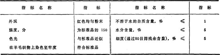 性能 红色粉末。溶于水为大红色溶液,微溶于酒精和溶纤素,不溶于其他有机溶剂。遇浓硫酸呈蓝光红色,将其稀释后呈较黄的红色;遇浓硝酸呈桔红色溶液,后转橙色;遇浓盐酸生成红色沉淀,稀释后即溶解。其水溶液加浓盐酸呈红色;加氢氧化钠溶液呈桔棕色。染色时遇铜离子使色泽带蓝光而暗;遇铁离子色泽带蓝色而浅。本品匀染性好。