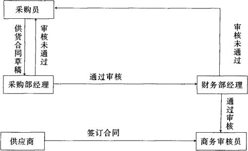 释义 | 采购合同管理流程 说明: 1.对于货物的采购合同要进行审核,采购人员必须将供货合同的草稿,报给采购部经理进行审核。 2.采购部经理如果认为合同欠妥,则退回业务人员重新拟订,如果同意签字、批准后转交财务部经理审核。 3.财务部经理如果认为欠妥,仍退回业务人员重新拟订,如果同意,签字、批准后可移交给商务审核员签定正式合同(商务审核员可由财务部经理兼任)。 4.合同签定后,供应商按照合同规定送货,则进入企业的收货程序。 5.购货合同控制制度: (1)合同编号 预先对每份购货合同进行编号,以确保日后合同能被完整地保存,并能够在会计上对所有购货合同进行处理。 (2)合同检查 在购货合同向供应商发出前,必须由专人检查合同是否得到授权人的签字,以及是否经采购部门的经理批准,以确定购货合同的有效性。 (3)由专人复查合同的编制过程和内容 包括复查有关供应商的主要文件资料、价格数量和金额的计算等等。其中价格须同根据过去经验确定的标准或平均价格相比照,以保证购货合同的正确性。 (4)填写合同一式三份 订购手续办完之后,应填写三份合同,并将第一、二份送采购部门登记以便让请购人证实购货合同的内容是否符合他们的要求,及验收部门以便他们在收到货物时,有验收的标准。 |