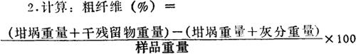 释义 | 重量法测定粗纤维 用乙醚将样品脱脂,用酸碱处理,除去其中糖类和蛋白质,再用丙酮除去单宁,色素等,将残渣减去灰分即得粗纤维。 试剂 (1)0.25N硫酸溶液:取7毫升浓硫酸(比重1.84)定容至1000毫升。 (2)0.313N氢氧化钠溶液:称12.52克氢氧化钠溶解并定容至1000毫升。 (3)防沫剂(辛醇)。 (4)丙酮。 (5)石棉:取石棉浸泡于0.25N硫酸中,煮沸30分钟,用水洗去酸液,再浸于0.313N氢氧化钠溶液中,煮沸30分钟,用水洗去碱液,烘干后在马福炉于600℃灼烧2小时后备用。 操作步骤 1.样品处理:准确称取2克样品,用乙醚浸2~3小时,除去脂肪。将无脂肪样品置500毫升烧瓶内,加入200毫升0.25N硫酸及1滴辛醇(防沫剂),连接回流装置,加热沸腾回流30分钟,停止加热,用布氏漏斗抽滤,以沸水洗涤残渣至无酸性为止。将残渣移入烧瓶,加200毫升热的0.313N氢氧化钠溶液,连接同流装置,加热同流30分钟,再经布氏漏斗抽滤,以沸水洗残渣至不呈碱性,然后将残渣移至铺好石棉的古氏坩埚内,抽滤除尽水分,再用丙酮洗残渣。待丙酮挥发后,将坩埚置130℃烘2小时,在干燥器内冷却后称重。再置马福炉内500℃灰化3小时,于干燥器内冷却后称重。 |