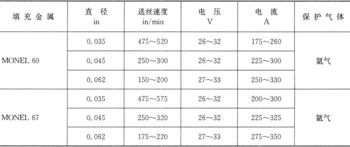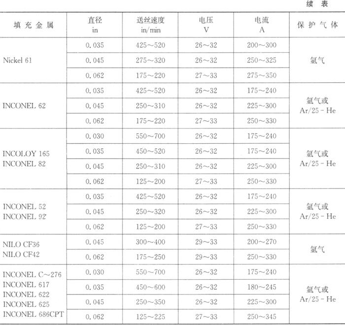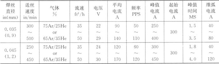释义 | 金属极气体保护焊 大多数镍合金能采用射流、短路和脉冲形式进行金属极气体保护焊(GMAW),不推荐采用颗粒过渡,因为它会造成不确定的过渡形式。 短路过渡通常用于连接厚度在3.2mm以下的薄件。短路过渡在低热输入下进行时会得到较好的结果,但一般仅局限于单道焊,在多道焊时常常会引起未焊透和未熔合等缺陷。 射流过渡是焊接厚件非常有效的方法。射流过渡在高热输入下进行,它会得到稳定的电弧和高的熔敷速率。射流过渡通常局限于平焊位置焊接。就对材料的影响而言,射流过渡又是一种要求非常严格的过程,某些镍合金因为凝固和热裂纹问题不能采用射流过渡。 表5.6-1示出GMAW射流过渡时的推荐规范。 表5.6-1 镍合金GMAW射流过渡时的规范指南 注:气体流量为1.3~2.2m3/h(35~60ft3/h) 脉冲过渡时,脉冲频率通常为60~120n/s,在高脉冲频率时,熔池温度较低,故能在不适当的位置焊接。脉冲过渡的规范见表5.6-2。 表5.6-2 镍合金GMAW脉冲过渡时的规范指南 GMAW时,保护气体与材料和焊接工艺有关,并随金属过渡形式的改变而变化。在大多数情况下,采用氩气或氩氦混合气体。在短路过渡时,Ar+He最好,因为氦的润湿作用会形成较平的焊道并降低冷夹的影响。 在脉冲过渡时,亦推荐Ar+He保护(He15%~20%),流量为0.7~1.3m3/h。有时亦采用更高的氦气百分比。 在射流和颗粒过渡时,最好采用纯氩。 对焊丝直径来说,射流过渡用Φ1.1mm焊丝,脉冲过渡用Φ0.9~1.1mm焊丝,短路过渡时用Φ0.9mm焊丝。在所有过渡形式下,均采用DCEP直流反接。 |