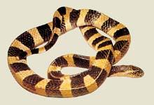 释义 | 金环蛇(Bungarus fasciatus) 亦称“黄节蛇”、“金甲带”。 爬行纲,眼镜蛇科。一种毒蛇。全长一般在1米左右。头部和颈部的背面均为黑色,有 生活于平原、山地、湿地、池边等处,以鼠、蛙、蜥蜴、蛇卵、鱼类等为食。卵生。 分布于中国云南、广西、广东、海南、福建;也产于印度及东南亚一带。可浸制蛇酒供药用。 金环蛇 |